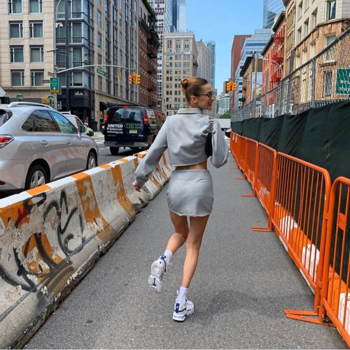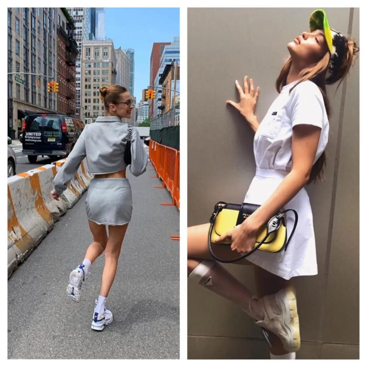 نسّقت جيجي حديد تنورة قصيرة مع حذاء رياضي وقبعة لاطلالة رياضية بامتياز ، أمّا بيلا فاختارت اطلالة شبيهة لاطلالة جيجي، ونسّقت معها شنطة الكتف .