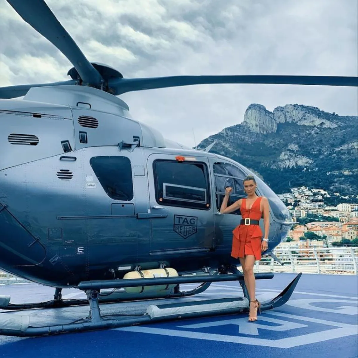 تميّزت كل من بيلا و جيجي بفستان قصير بصيحة مختلفة عن الأخرى ، اختارت بيلا فستاناً من اللون البرتقالي مع حزام أسود عريض يضمّ الخصر ، نسّقت معه حذاءً بكعبٍ عالٍ.