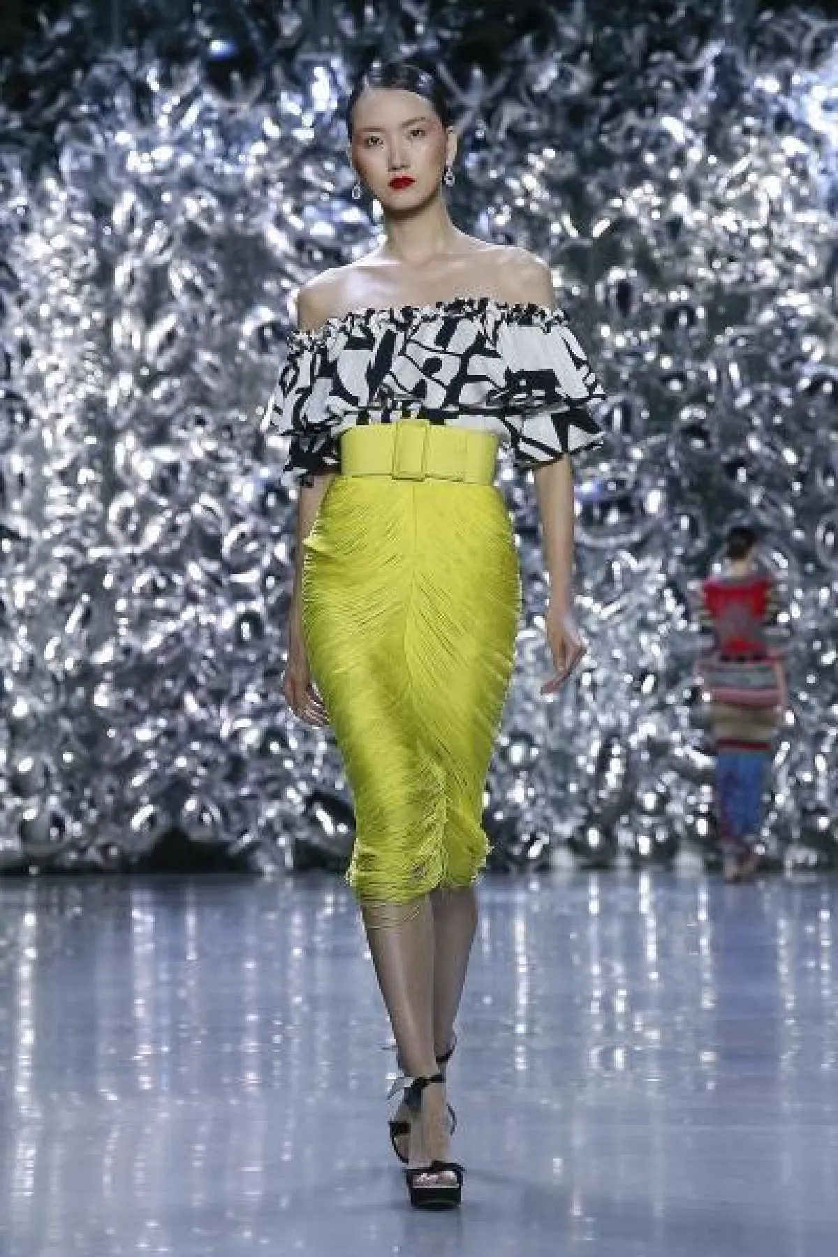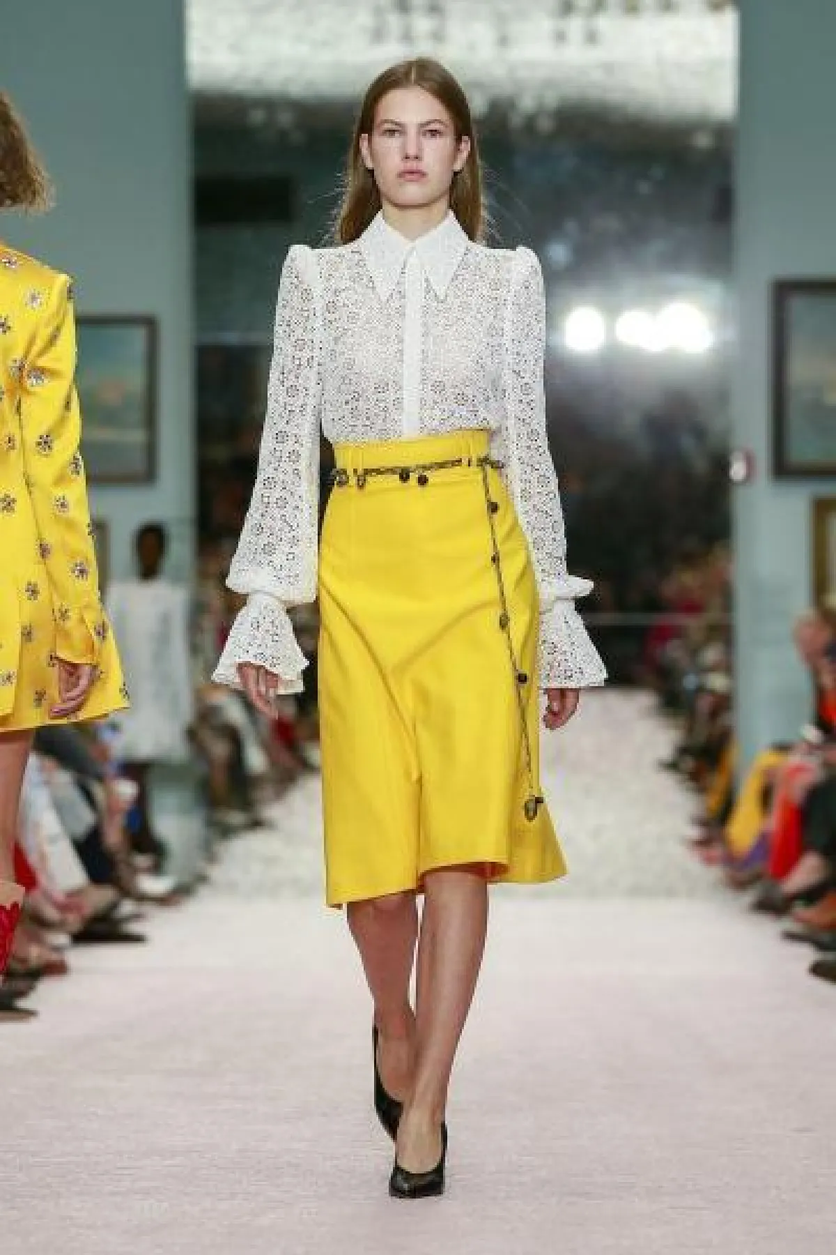 كما ننصحك بتجربة تنسيق التنورة باللون الأخضر الليموني والمميزة بقصة الـ Pencil cut مع بلوزة Off Shoulder مونوكروم بطبعات ناعمة على طريقة عارضة نعيم خان Naeem Khan أو مع قميص أبيض لطلعات النهار.