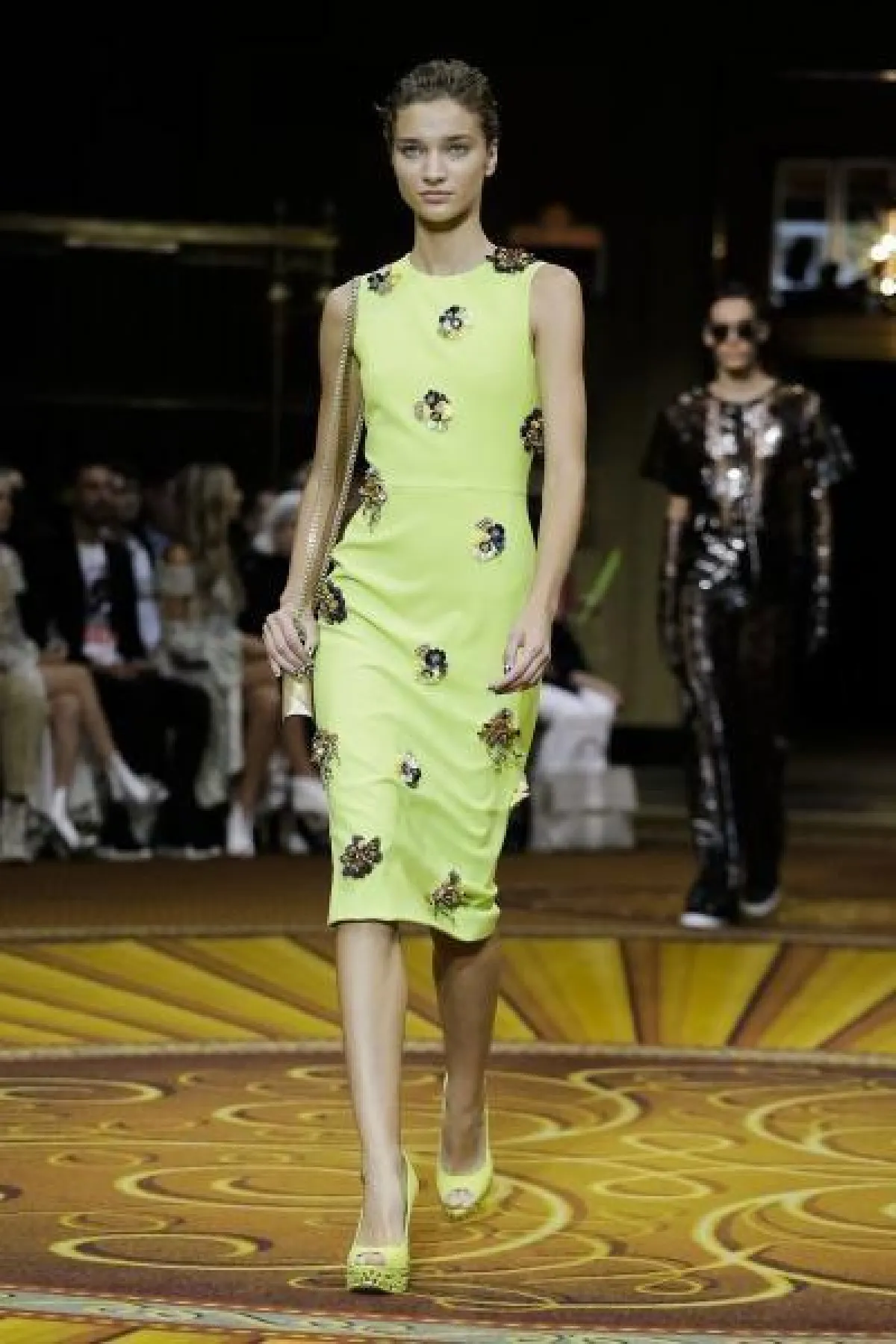 من بين درجات ألوان النيون الأكثر رواجاً لهذا الموسم كان الأصفر والأخضر الليموني وقد شاهدنا هذان اللونان بشكل خاص على الفساتين لدى كل من كريستيان سيريانو Christian Siriano، ليلا روز Lela Rose وموسكينو Moschino، ننصحك بتنسقيها مع صندال أو حذاء مدبب Pointy shoes من نفس اللون و حقيبة بيضاء خلال النهار ولمشاوير المساء اختاري حقيبة كتف ذهبية مزودة بسلسال.