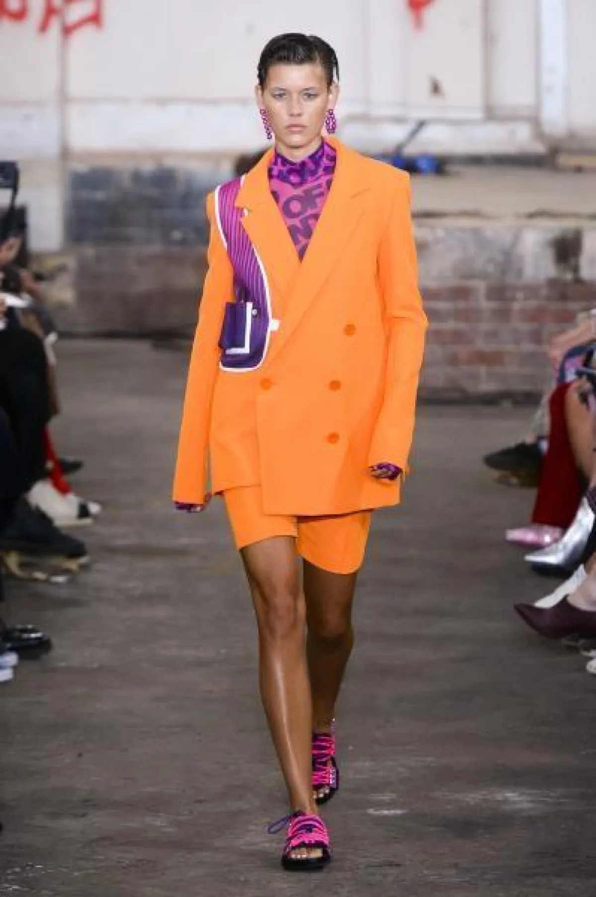 والجدير بالذكر أن النصيب الأكبر من الأزياء المصممة بنغمات النيون الفاقعة كانت لدى ماركة هاوس أوف هولاند House of Holland والتي أبتكرت بدلات برتقالية مؤلفة من جاكيت مزدوج الصدر Double breasted jacket وشورت قصير ونُسقت مع توب وصندال وأقراط باللون الفوشيا.