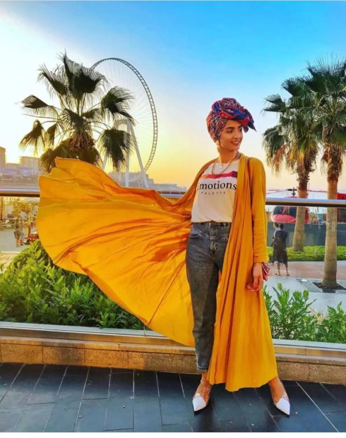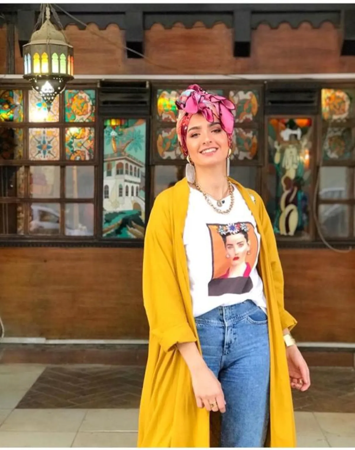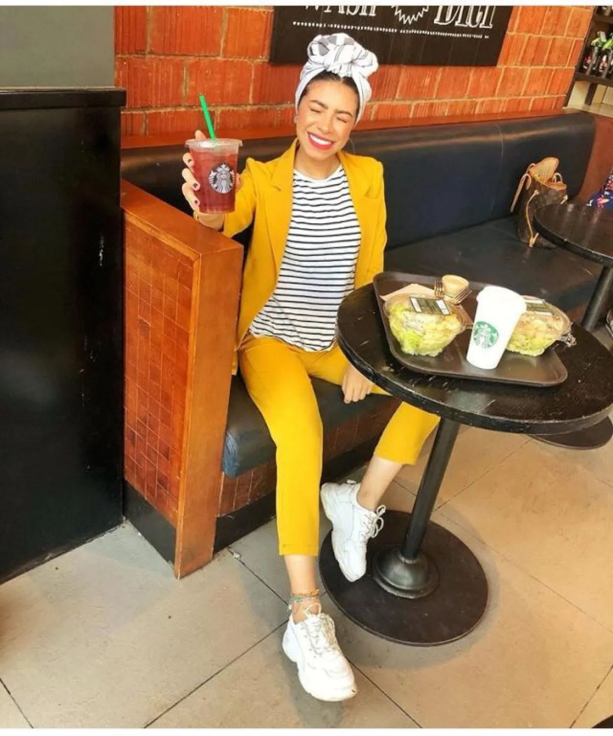 إن كنتِ تمتلكين شخصية مجنونة؛ فنتوقع أن أول ما يلفت انتباهك هو هذه البدلة الكاملة باللون الأصفر الخردلي، التي اعتمدتها المدونة المصرية «منة السوني»، نسقت معها «تي شيرت» مخططاً باللون الأبيض، وتوربان، وسنيكرز باللون ذاته، من الممكن أن تتخلي عن المخطط، وتختاري «توب» أبيضَ فقط، مع شنطة نود، أو بيضاء.
