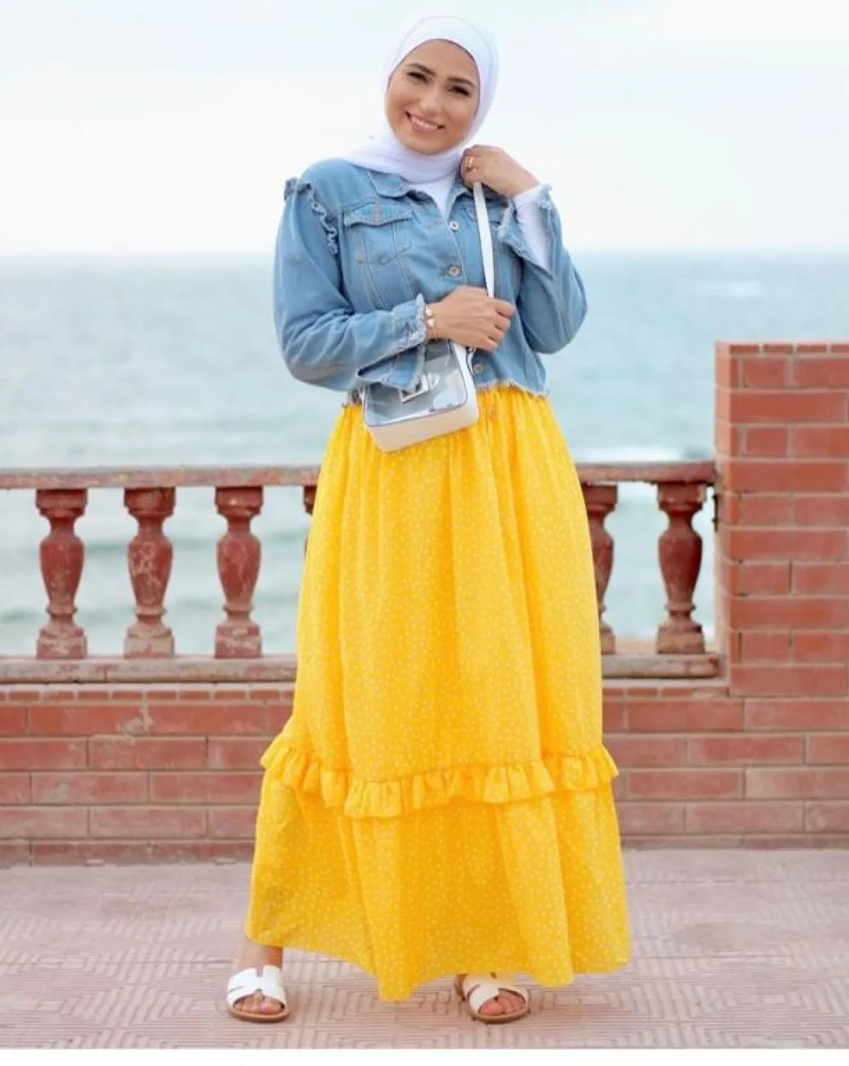 من الخيارات المميزة التي يمكنكِ اعتمادها بدرجة الأصفر الخردلي، هو اختيار هذه التنورة من المدونة «وفاء عز الدين»، التي نسقت معها «جاكيت» جينز قصيراً أساسياً بخزانة المحجبات، وحذاءً مفتوحاً صيفياً، لإطلالة مناسبة لجميع مشاويرك طوال اليوم.