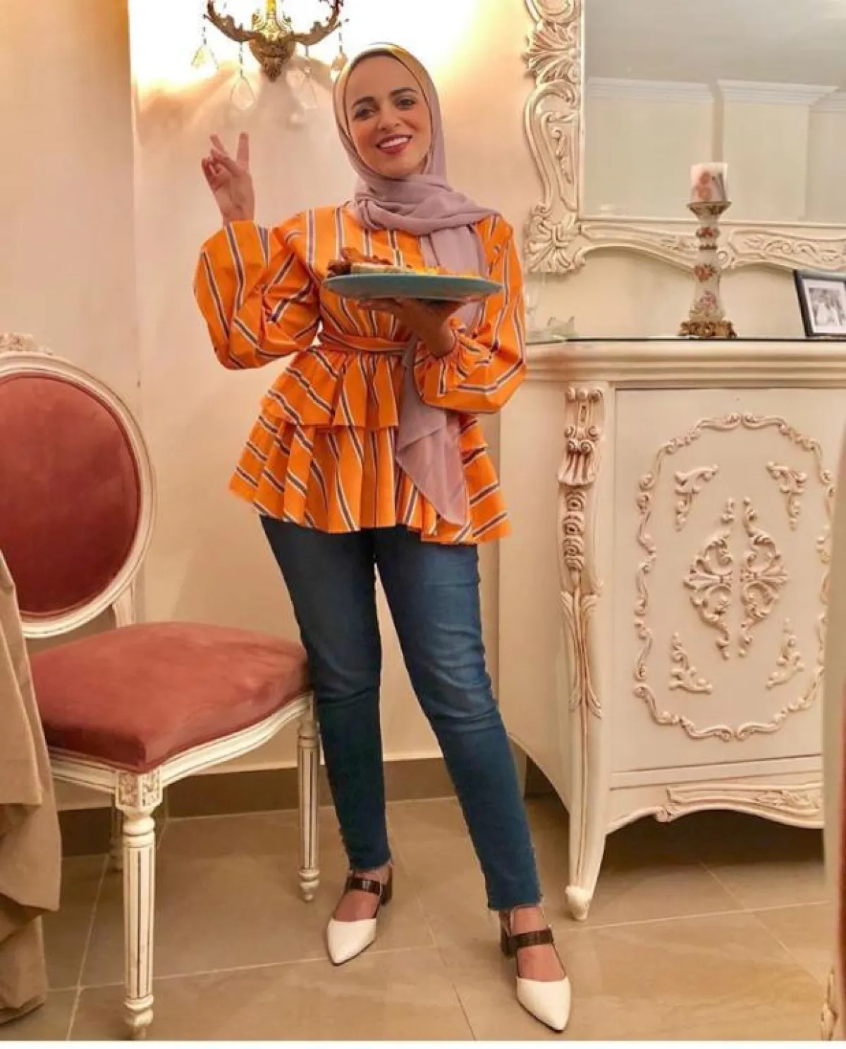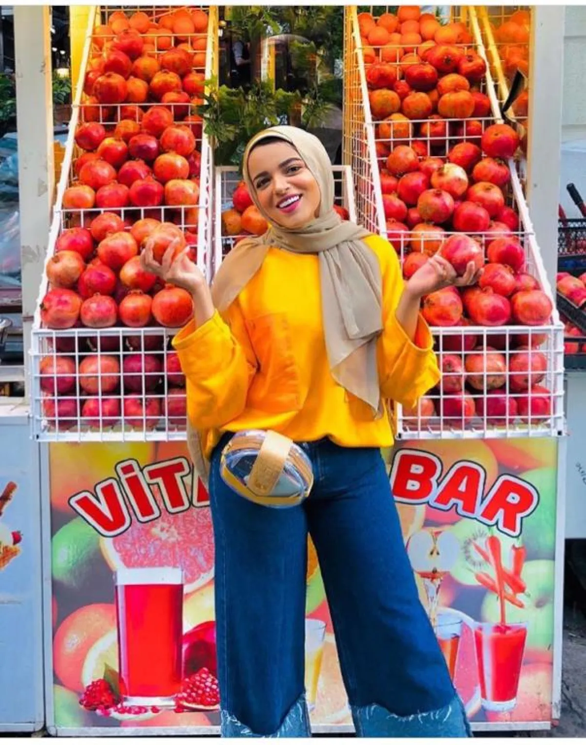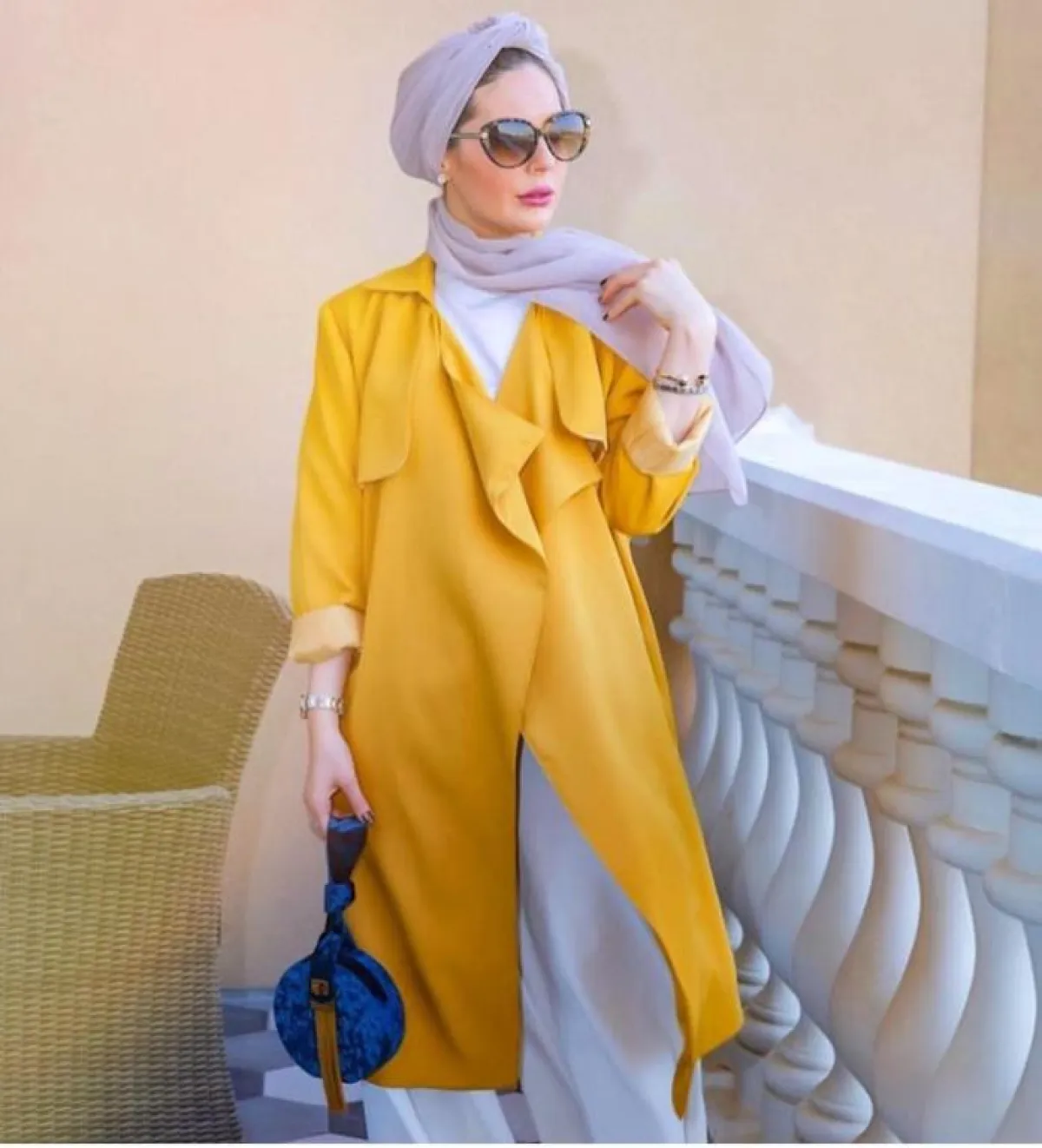 في المقابل، ظهرت المدونة «سهر فؤاد» ببلوزة باللون الأصفر المستردة، من الستان الناعم، مع الجينز الكحلي بدرجة داكنة؛ تبرز جمال البلوزة، وشنطة الحزام بلمسة ذهبية؛ لإطلالة مترفة أكثر، ومتناغمة مع الألوان الصيفية، لهذا كان اختيار الطرحة النود مميزاً، مع اللمسة اللامعة في البلوزة، ومناسباً للون بشرتها أيضاً؛ حتى لا تبدو متكلفة.