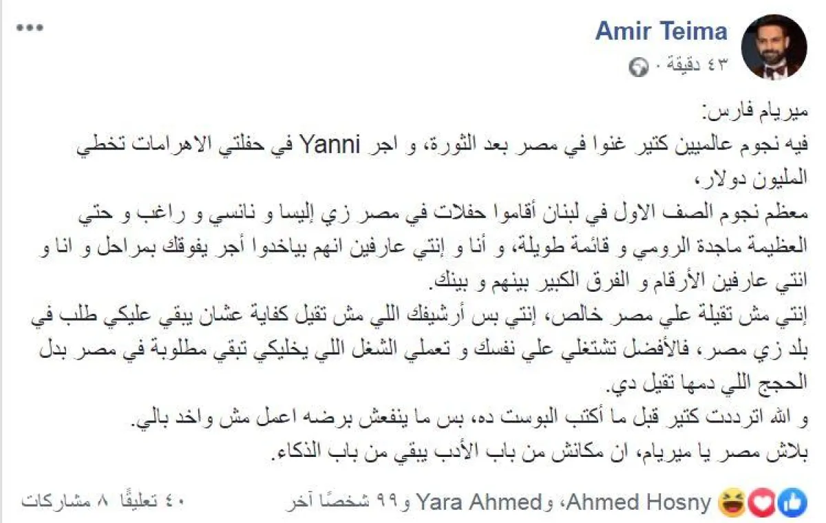 وأضاف: "إنتي مش تقيلة علي مصر خالص، إنتي بس أرشيفك اللي مش تقيل كفاية عشان يبقي عليكي طلب في بلد زي مصر، فالأفضل تشتغلي على نفسك وتعملي الشغل اللي يخليكي تبقى مطلوبة في مصر بدل الحجج اللي دمها تقيل دي، والله اترددت كتير قبل ما أكتب البوست ده، بس مينفعش برضه اعمل مش واخد بالي، بلاش مصر يا ميريام، إن مكانش من باب الأدب يبقى من باب الذكاء”.