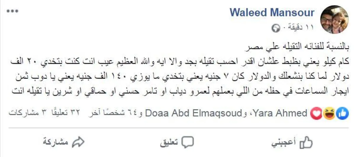 المُنتج ومنظم الحفلات وليد منصور الذي قدم 80 بالمئة من حفلات ميريام في مصر، وجه لها رسالة نارية قائلا: "بالنسبة للفنانه التقيله على مصر، كام كيلو يعني بظبط علشان اقدر احسب تقيله بجد والا ايه والله العظيم عيب انت كنت بتخدي ٢٠ الف دولار لما كنا بنشغلك والدولار كان ٧ جنيه يعني بتخدي ما يوازي ١٤٠ الف جنيه يعني يا دوب ثمن إيجار السماعات في حفله من اللي بعملهم لعمرو دياب أو تامر حسني وحماقي وشيرين يا تقيله انت".