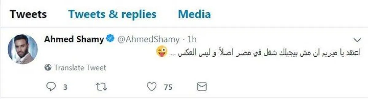 المطرب أحمد الشامى عبر عن غضبه أيضا عبر تويتر، مؤكدا أن ميريام لا تقيم حفلات في مصر لأن لا أحد يطلبها للعمل وقال: "أعتقد يا ميريام إن مش بيجيلك شغل في مصر أصلا وليس العكس".