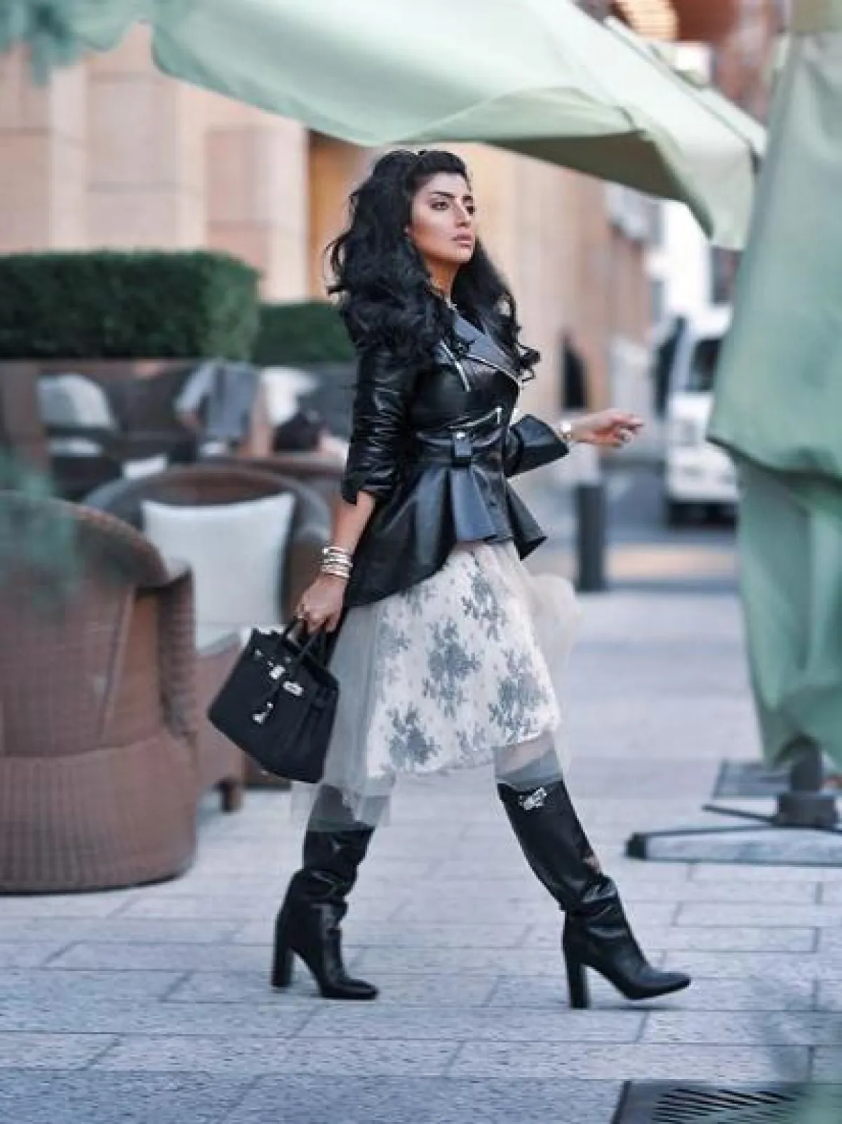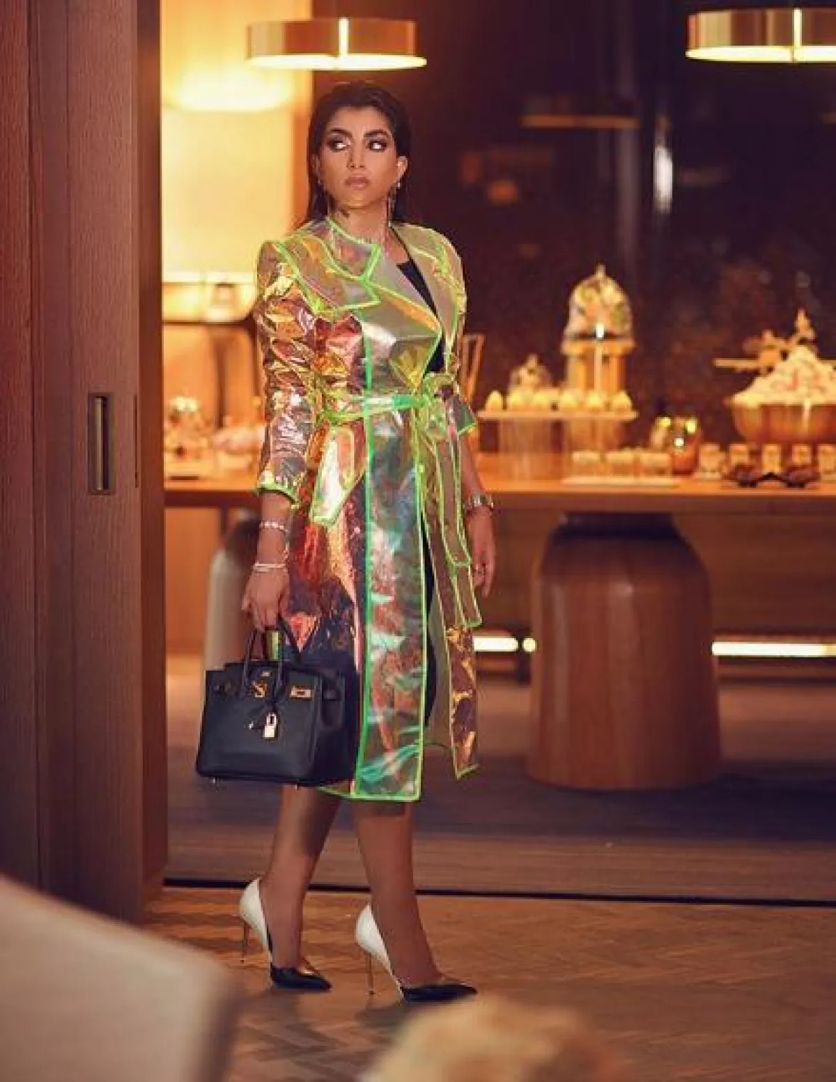 لأحد المناسبات المسائية شاهدنا بثينة الرئيسي وقد اختارت لوك عصري ومبتكر وكان عبارة عن فستان ميدي باللون الأسود نسقت من فوقه معطف بتصميم غريب مصنوع من قماش البلاستيك اللامع بدرجات الميتالك وقد أكملت الاطلالة بحقيبة يد من الجلد الأسود من هرمس Hermes، وحذاء كعب عالي باللونين الأسود والأبيض من “توم فورد” Tom Ford.