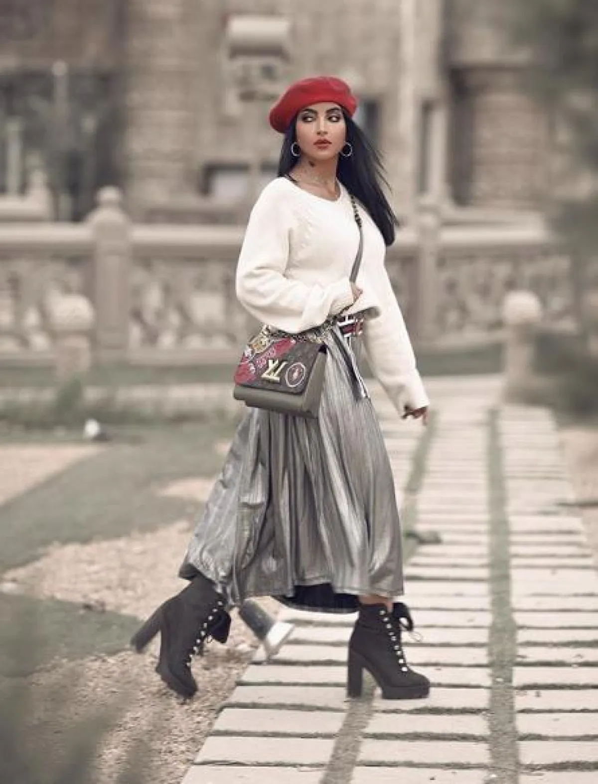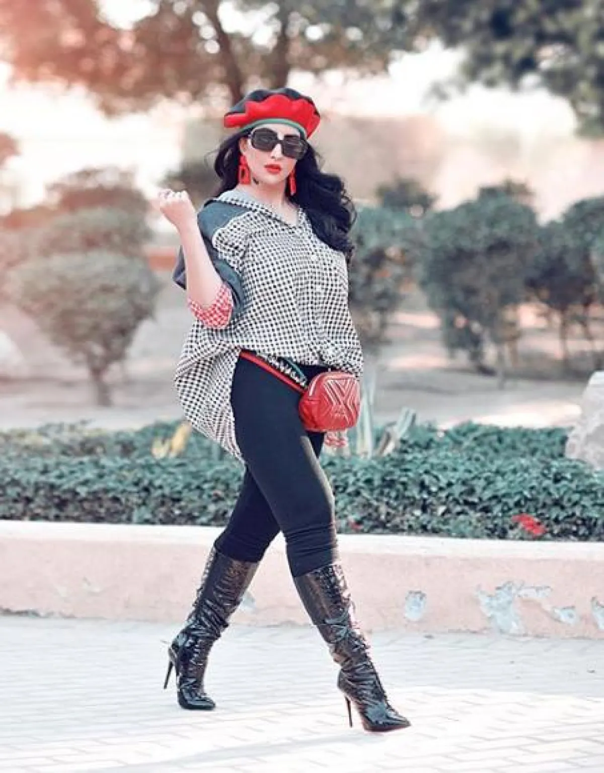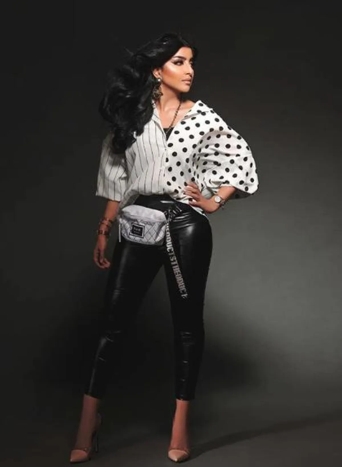 من المعروف عن بثينة الرئيسي أنها تعشق التنسيقات الشبابية ذات الطابع العصري مثل هذا اللوك الذي اختارت فيه بنطلون ضيق من الجلد باللون الأسود نسقت معه قميص بتصميم مميز من جهة منقط ومن جهة مقلم، وأكملت اللوك بحقيبة على الخصر وحذاء كعب عالي باللون البيج.