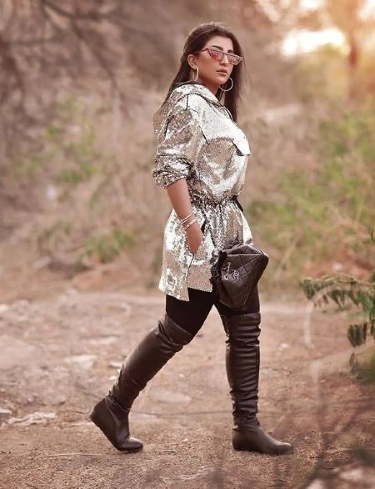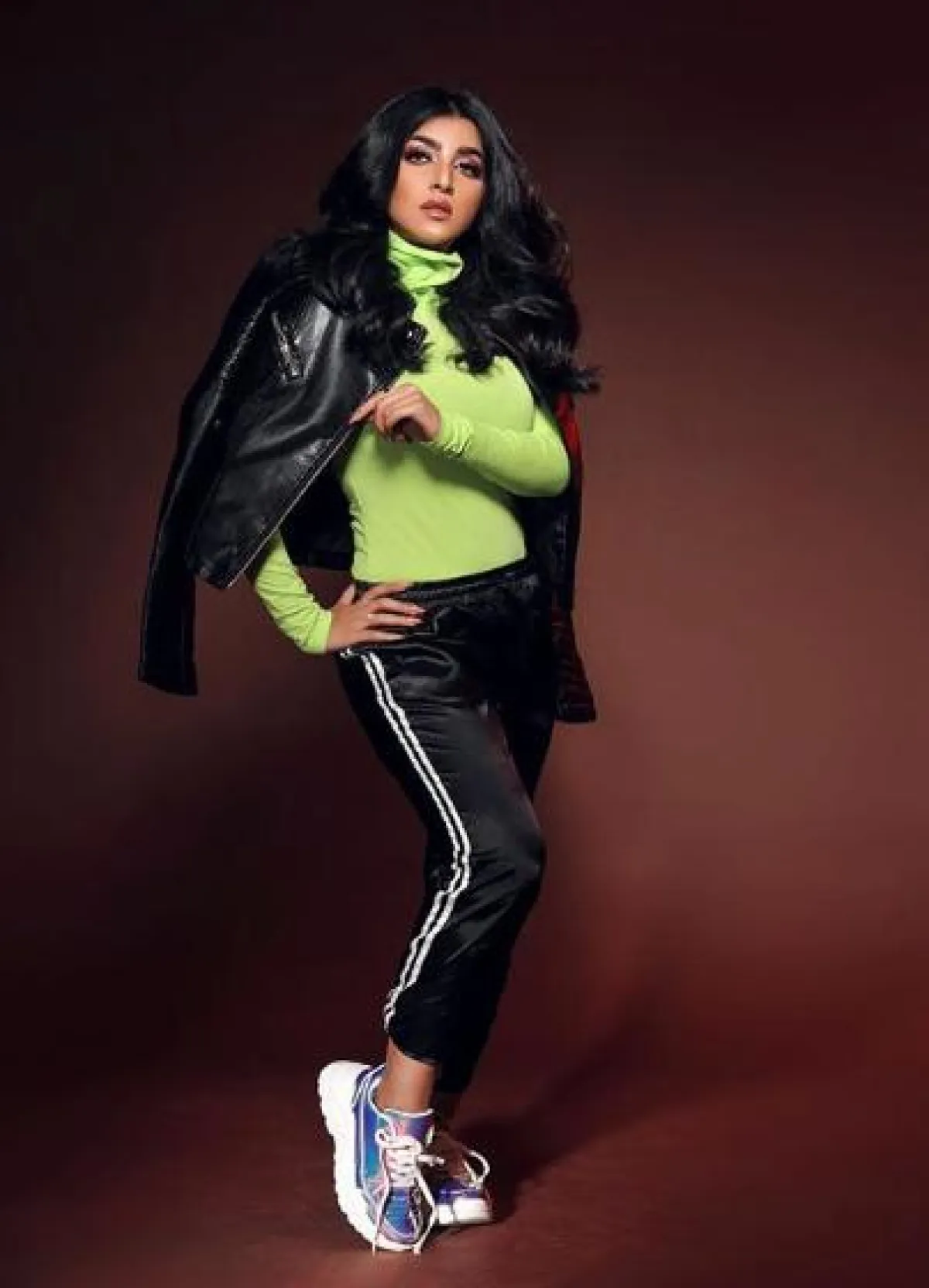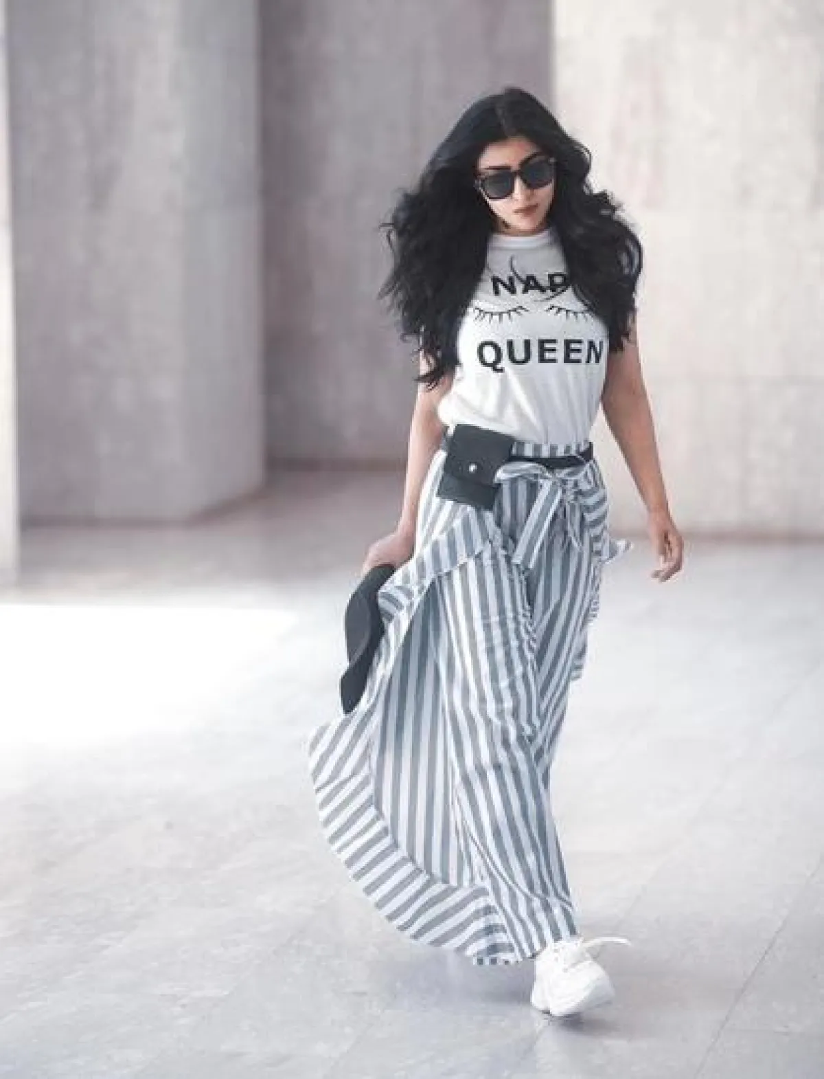 من المعروف عن بثينة الرئيسي أنها تعشق التنسيقات الشبابية ذات الطابع العصري مثل هذا اللوك الذي اختارت فيه بنطلون ضيق من الجلد باللون الأسود نسقت معه قميص بتصميم مميز من جهة منقط ومن جهة مقلم، وأكملت اللوك بحقيبة على الخصر وحذاء كعب عالي باللون البيج.