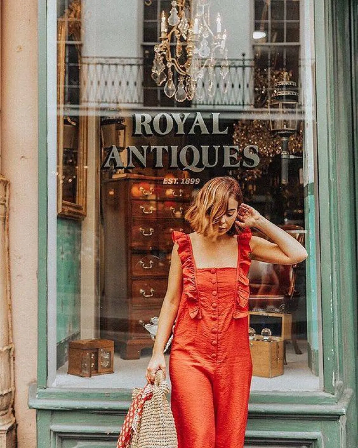 تمتّعي بإطلالة الجمبسوت الفضفاض المزيّن بصيحة الكرانيش على الأكتاف لإطلالة نهارية كاجوال. نسّقي حقيبة القش مع أزيائك وصندل مفتوح.