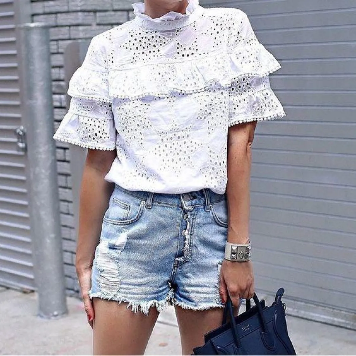 أو يمكنك تنسيق القميص الكشكش مع شورت جينز لإطلالة مفعمة بالأنوثة.