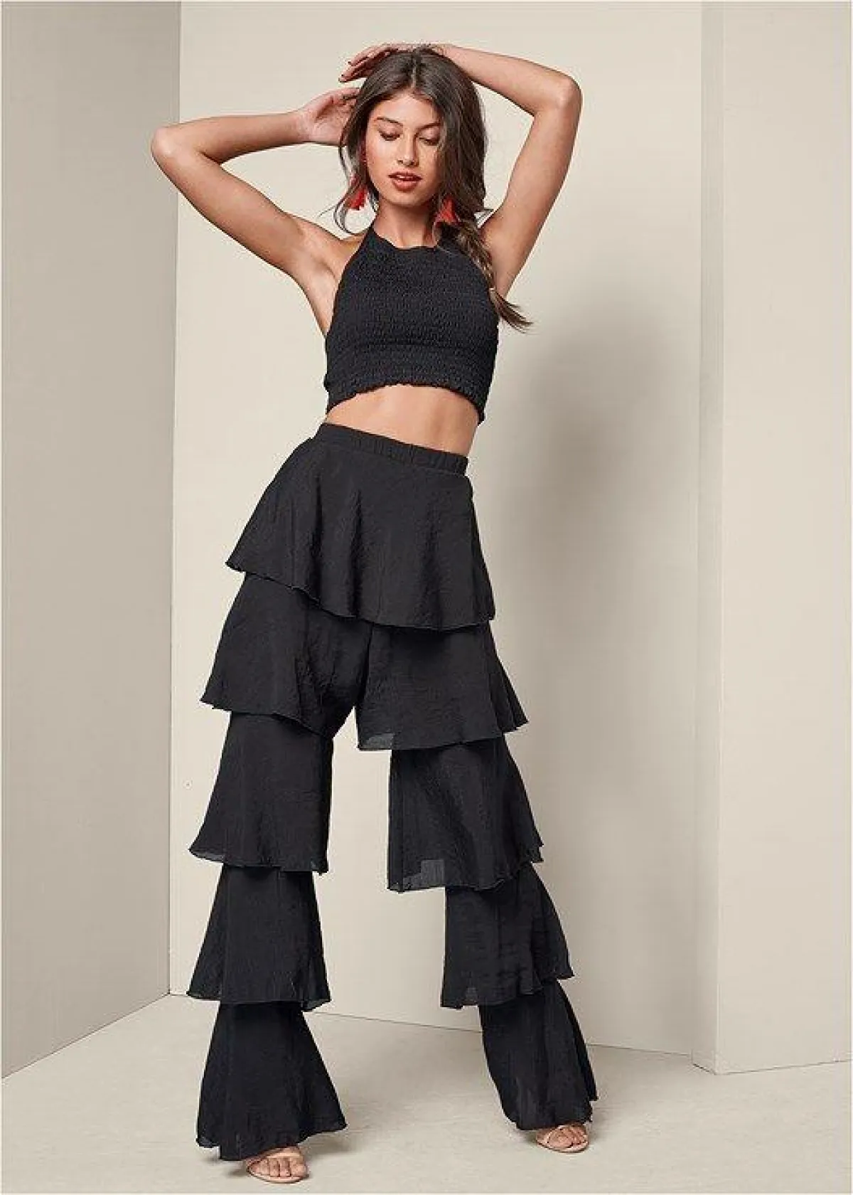 لإطلالة من لون موحّد؛ اختاري البنطلون من صيحة الكشكش باللون الأسود، مع كروب توب من اللون نفسه، وحذاء مفتوح نود.