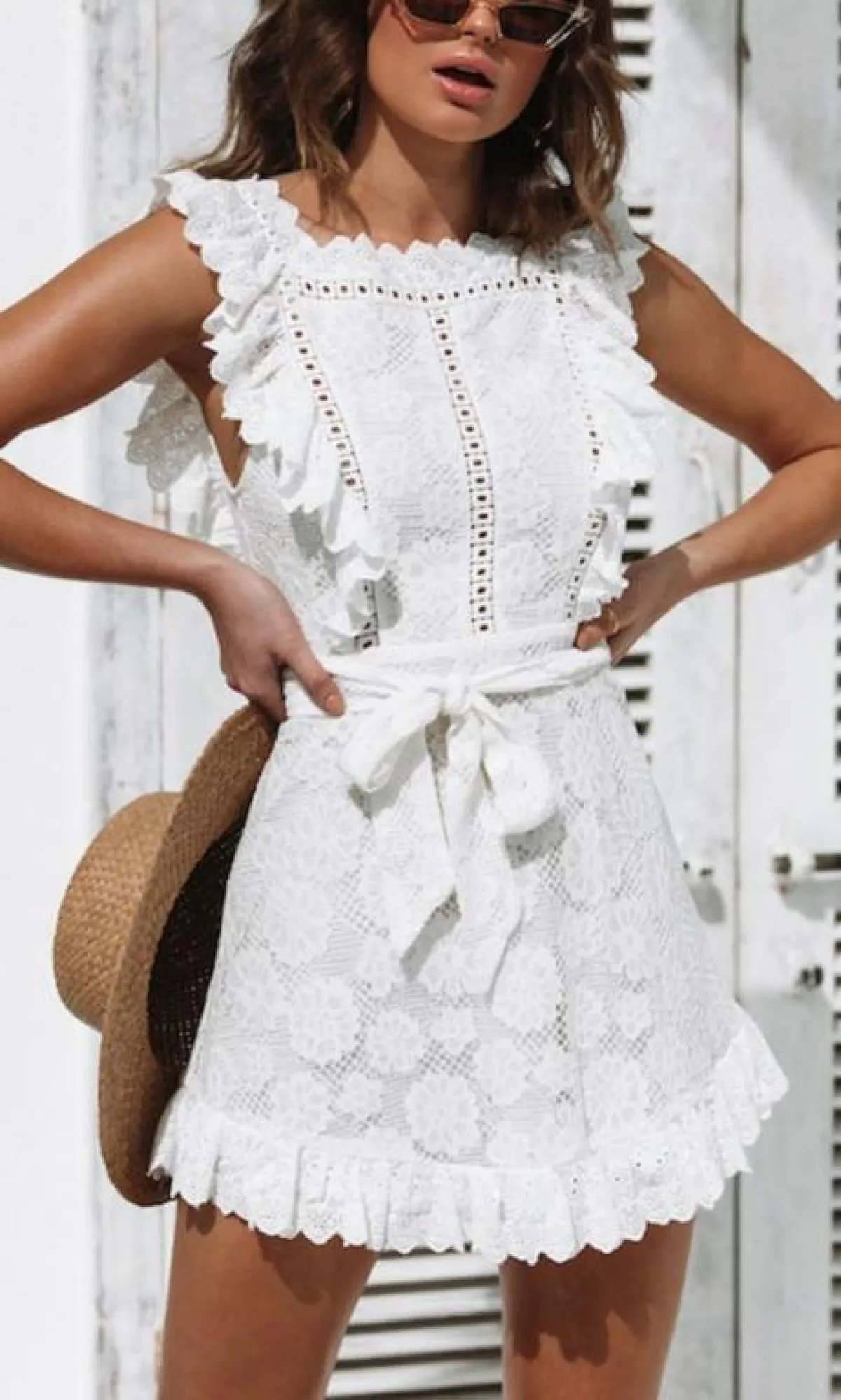 إن كنتِ تقصدين الذهاب لقضاء يوم على الشاطئ، يجب عليكِ انتقاء أزياء مريحة، لذلك نسّقي فستاناً قصيراً من اللون الأبيض، مزيّناً بالكشكش مع حزام الخصر من اللون نفسه، وقبعة الشاطئ بموديل القش.