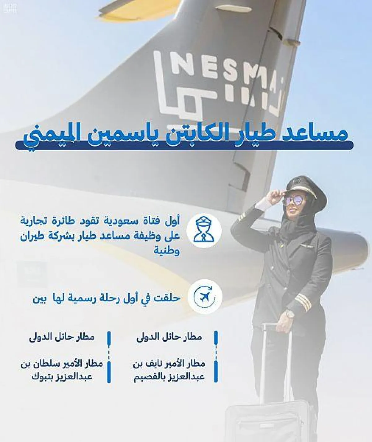 احتفلت الهيئة العامة للطيران المدني ممثلة في إدارة مطار حائل الدولي وشركة نسما للطيران، بأول رحلة رسمية للمساعد الطيار الفتاة السعودية الكابتن ياسمين الميمني (29 عاماً)، التي حلقت في أجواء المملكة عبر أول رحلة رسمية لها بين (مطار حائل الدولي – مطار الأمير نايف بن عبدالعزيز الدولي بالقصيم) و(مطار حائل الدولي – مطار الأمير سلطان بن عبدالعزيز الدولي بتبوك).