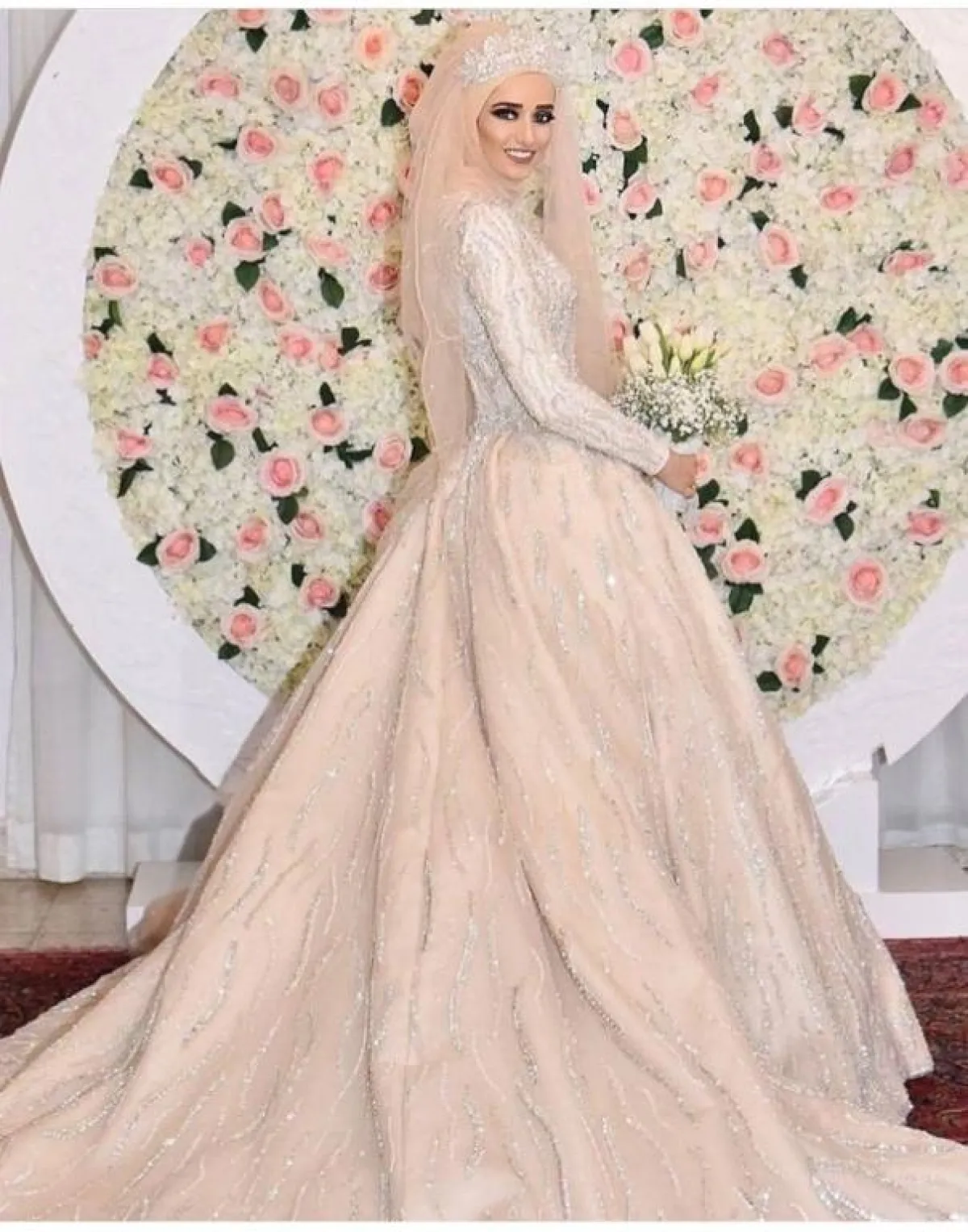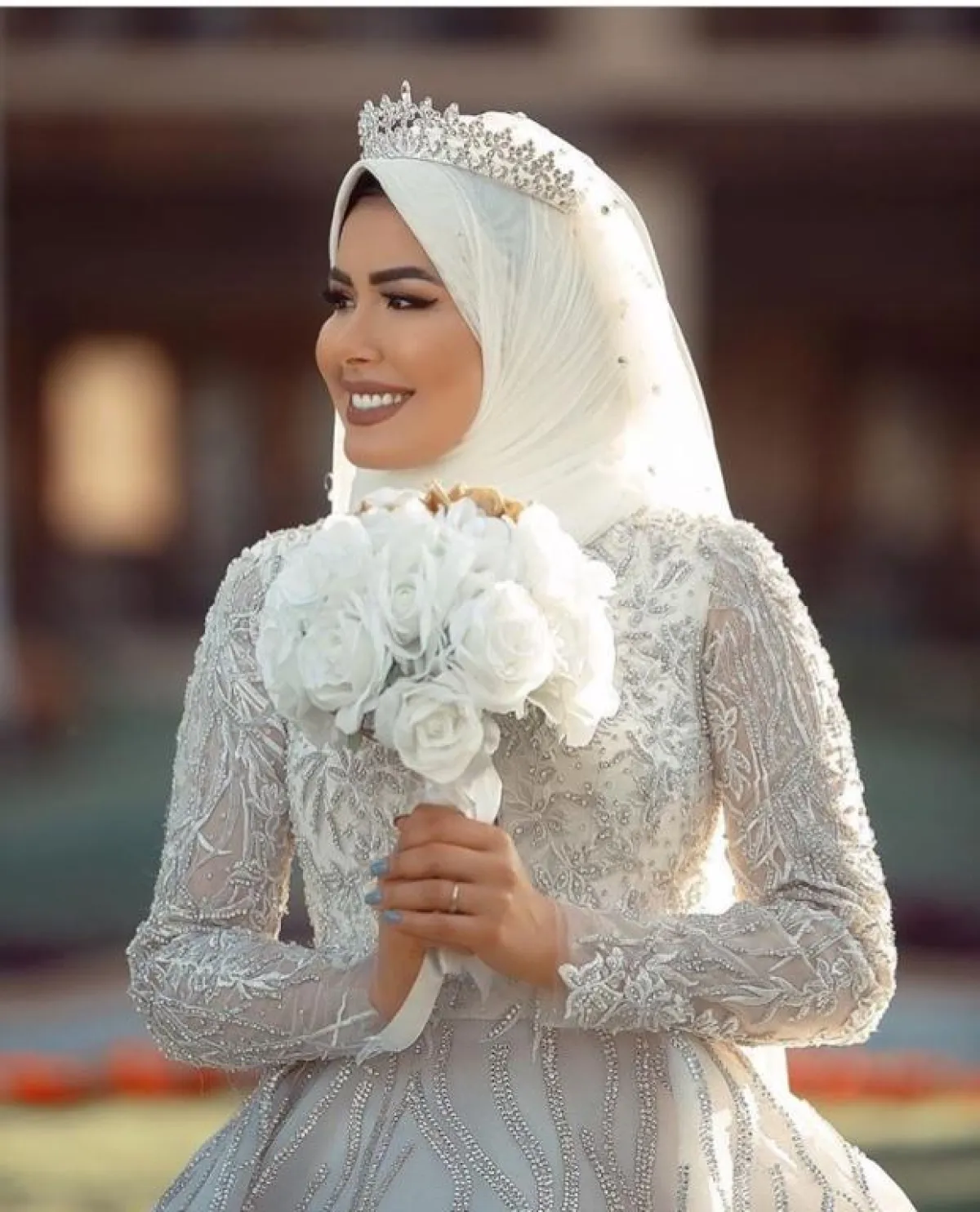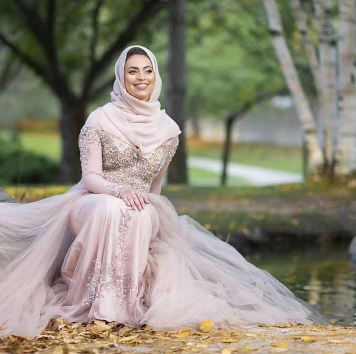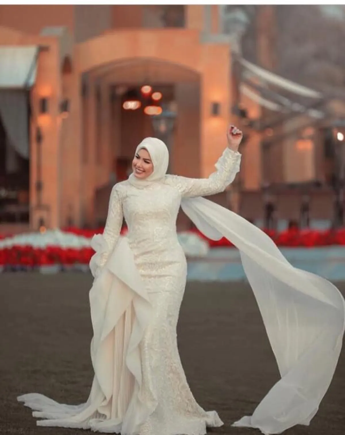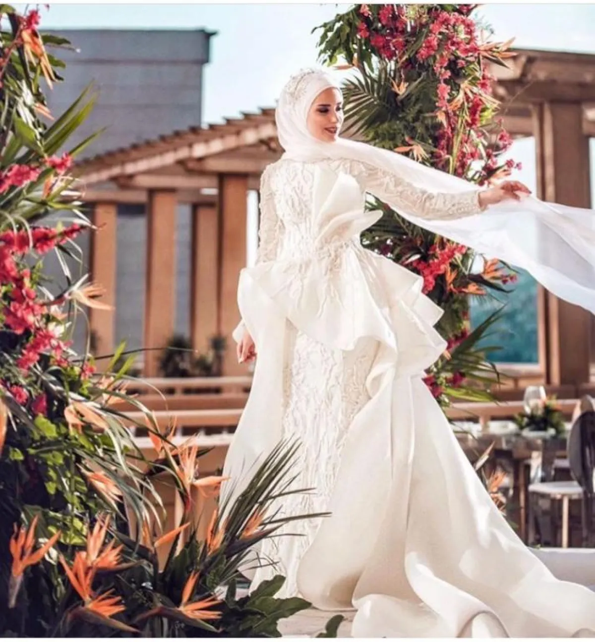 يمكنكِ اختيار الفستان بتصميم حورية البحر، مع الأكمام الطويلة محتشم وبسيط، مع لمسات مزركشة من القماشة نفسها على الفستان، ولكننا لا ننصحكِ باعتماد خامة الستان اللامعة والتي تُبرز الجسم بشكل كبير، وقد لا تناسب المحجبات بشكل عام، من الممكن أن تعتمدي معها إحدى لمسات الشيفون للمسة مختلفة.