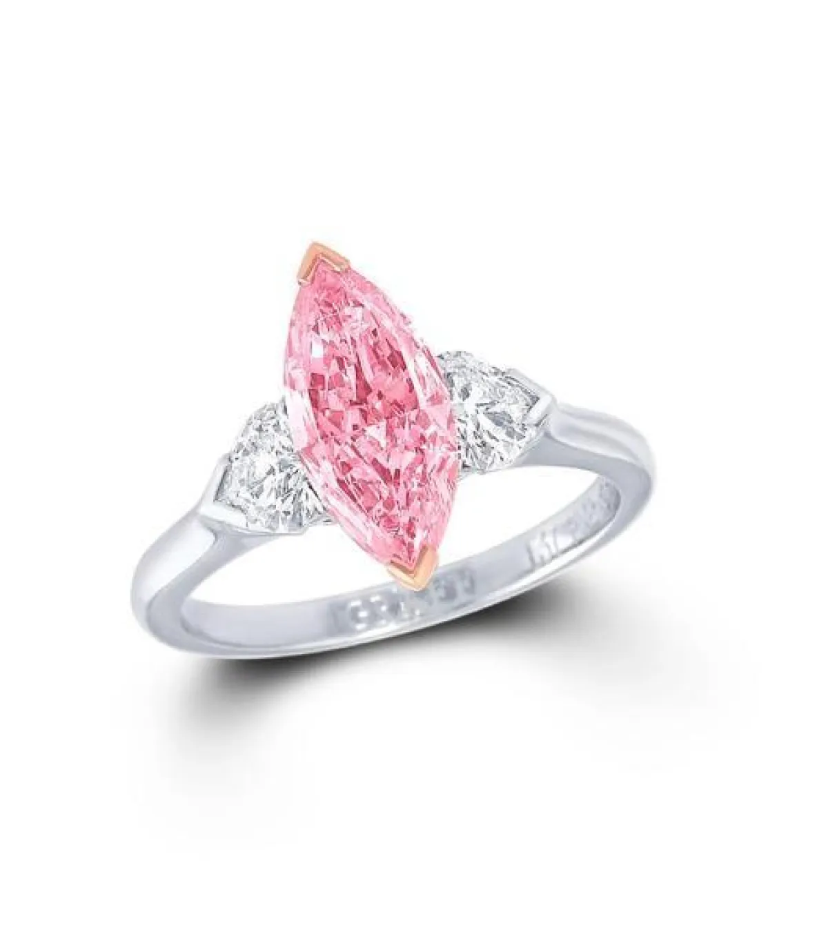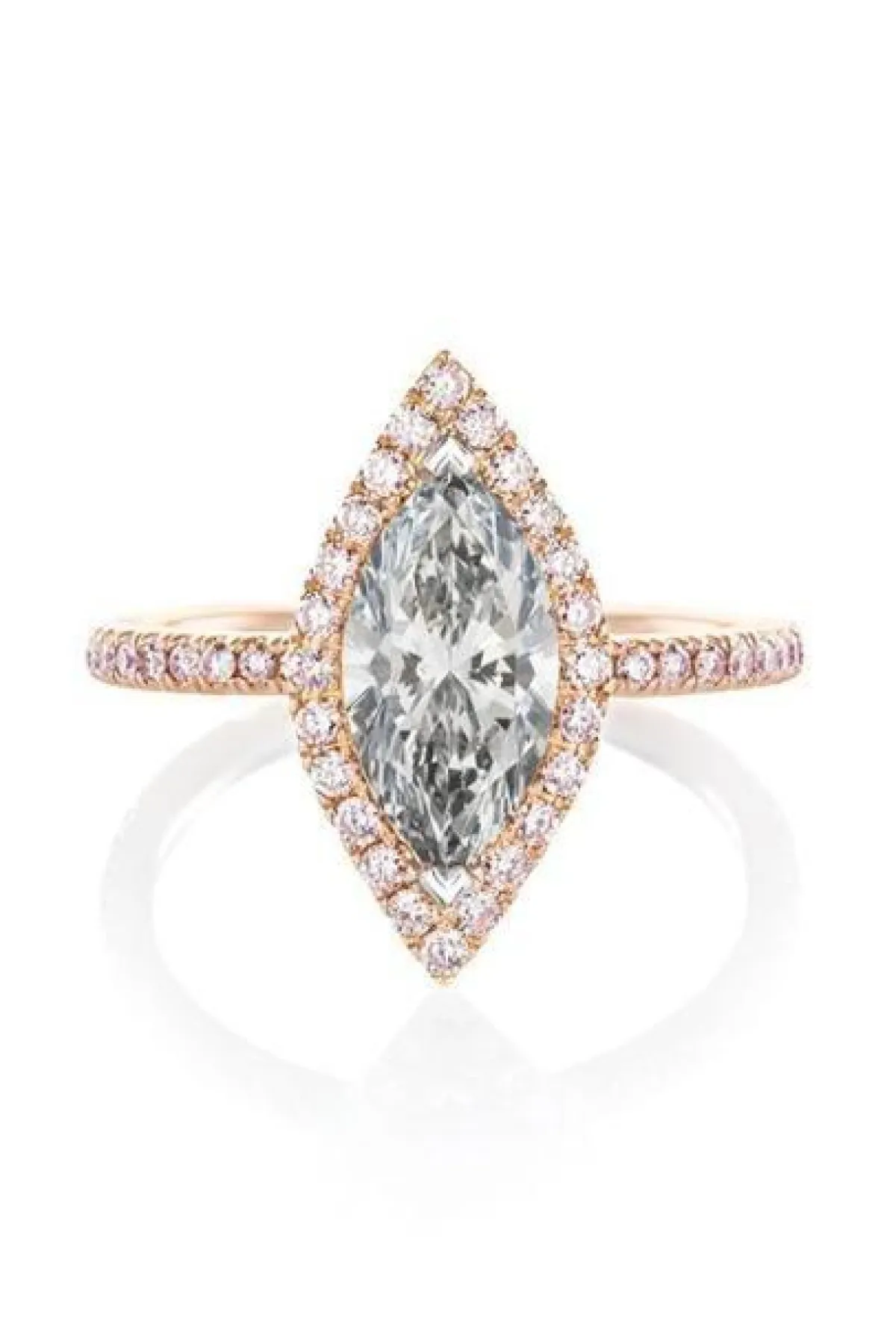 كذلك قدمت ماركة غراف Graff تصميم مميز لخاتم الماركيز بالذهب الوردي والمرصع بفص ألماس أبيض في منتصفه، وعلى جانبيه فصوص الألماس الوردي المتناغمة مع لون الذهب.