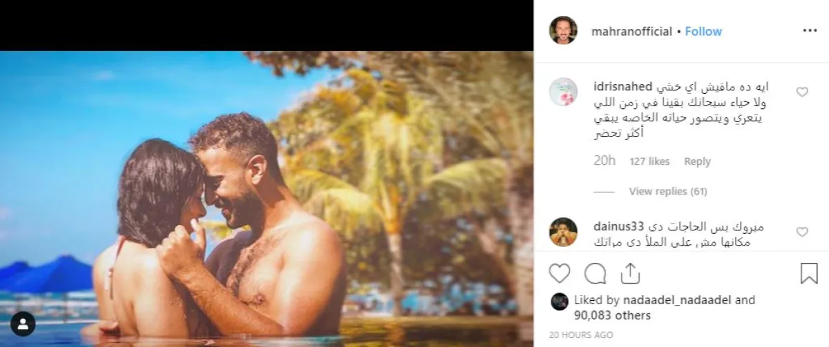 مهران نشر صورة واحدة من حفل الزفاف، وأعقبها بنشر صورة هي الأولى من شهر العسل، وتجمعه بزوجته داخل حوض السباحة، وتم التقاط الصورة لتظهرهما وكأنهما دون ملابس، وعلى الفور انطلقت التعليقات الصادمة، والمفاجأة أن أغلبها من المعجبات، فقالت متابعة، تدعى «ديانا»: «مبروك.. بس الحاجات دي مكانها مش على الملأ.. دي مراتك.. عرضك وشرفك.. وإنت حرّ ف الآخر.. لكن إنت مش حرّ في اللي بتعلمه للناس.. بكرة نلاقي واحد بيتصوّر في أوضة النوم بعده.. واحد بيصوّر دخلته.. وهكذا.. ربنا يهدي».