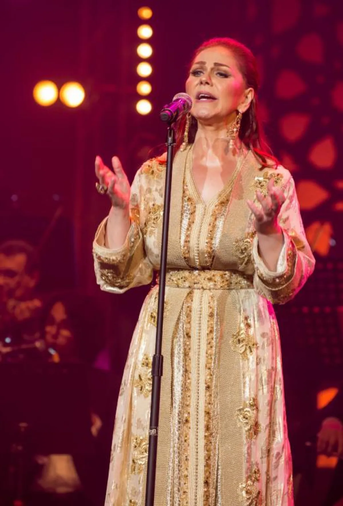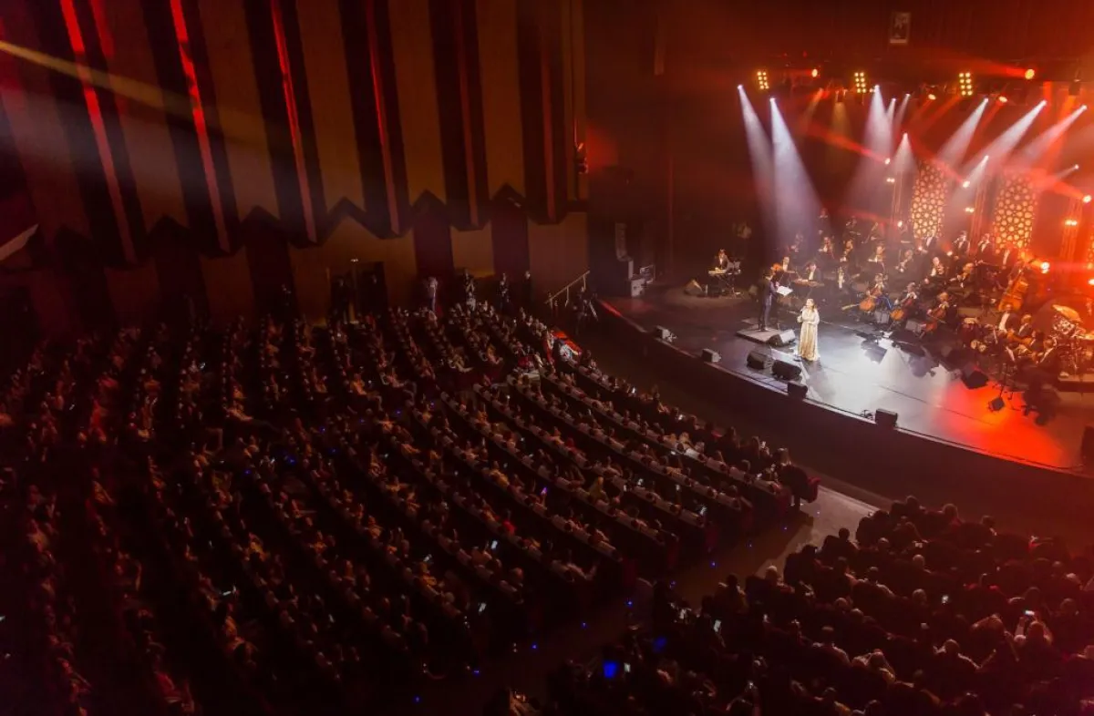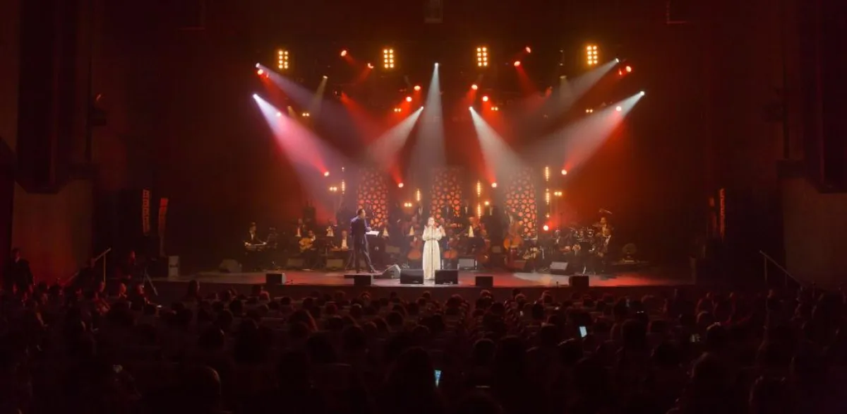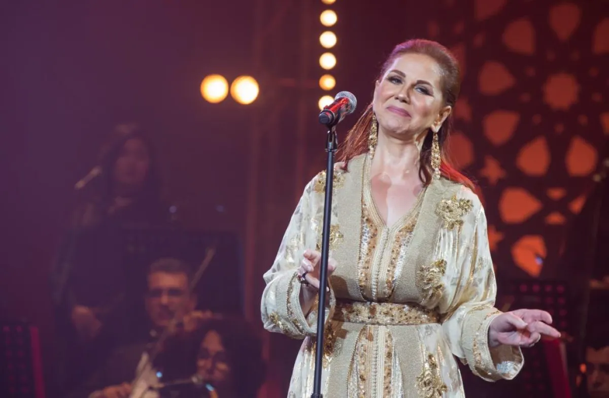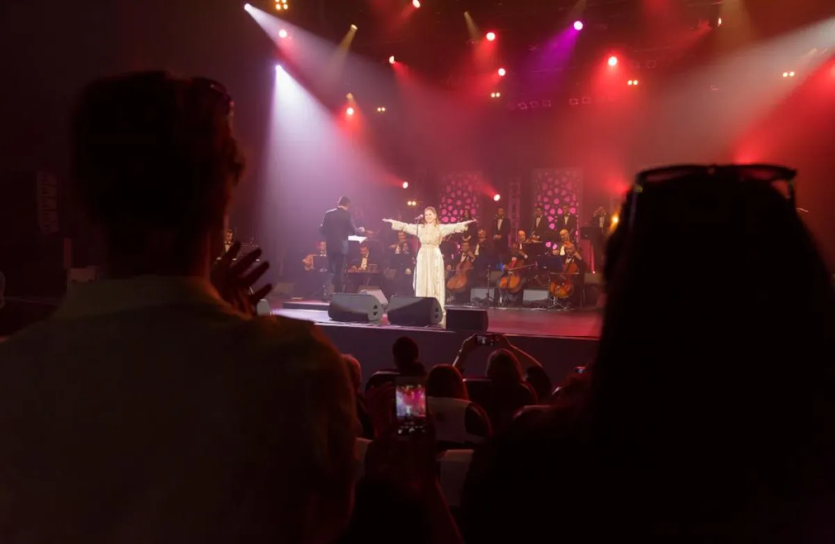 ومنذ اللحظة الأولى لاعتلائها خشبة المسرح، خطفت الفنانة السورية بإطلالتها المتألقة، مرتدية قفطاناً ذهبياً مرصعاً بالأحجار المتلألئة؛ أنظار الجماهير التي ما إن خفتت الأضواء واعتلت الفرقة الموسيقية خشبة المسرح وأطلت بعدها ميادة الحناوي حتى توقفت صور السيلفي والدردشات الثنائية، وتوجهت الأنظار إليها حتى اشتدت التصفيقات ترحيباً ليعم الصمت.