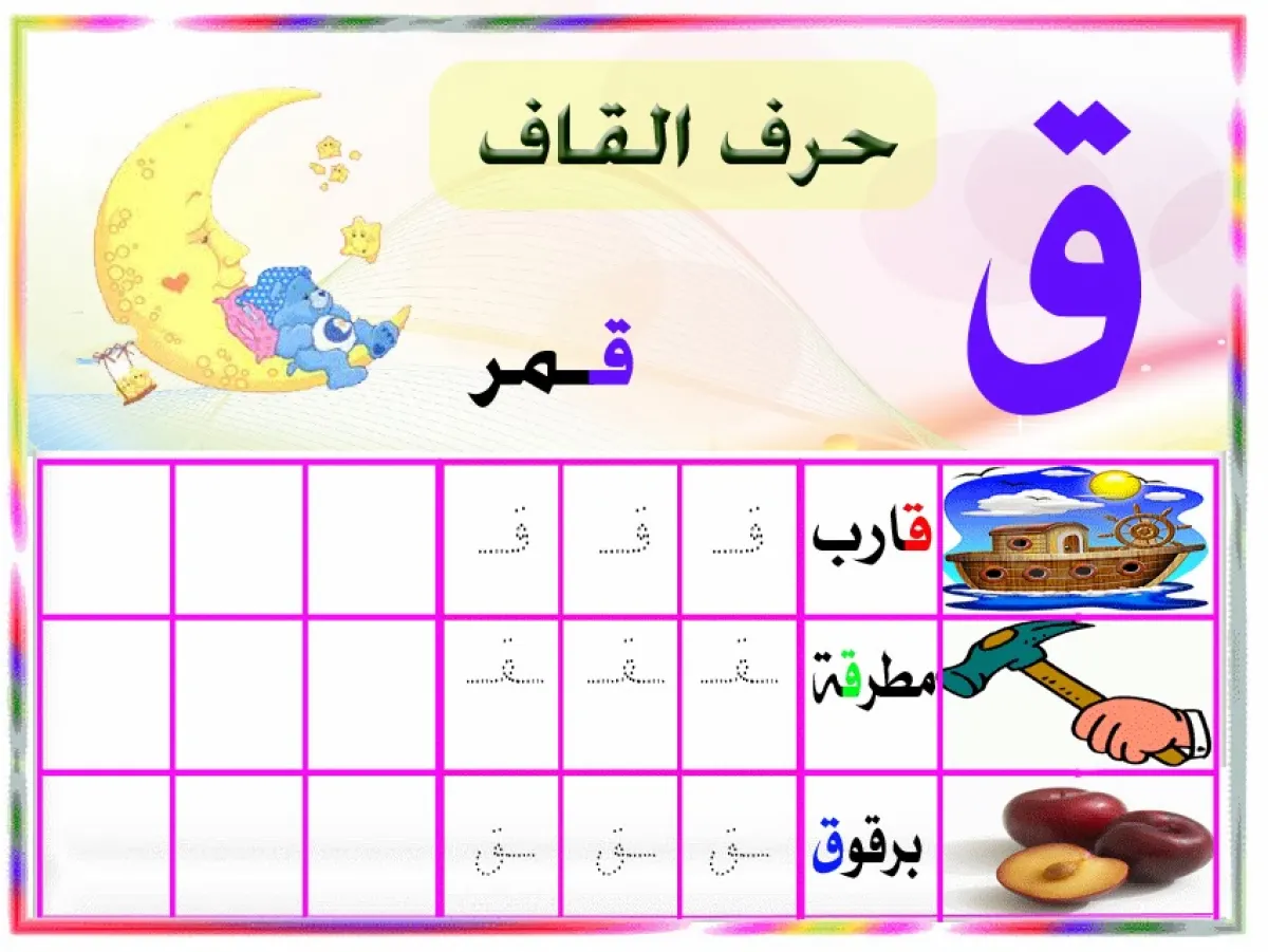 الآن يكون قاموس كلمات طفلك قد اتسع، فاطلبي منه كلمات تحتوي على حرف القاف وأقربها: قلم، قطة.