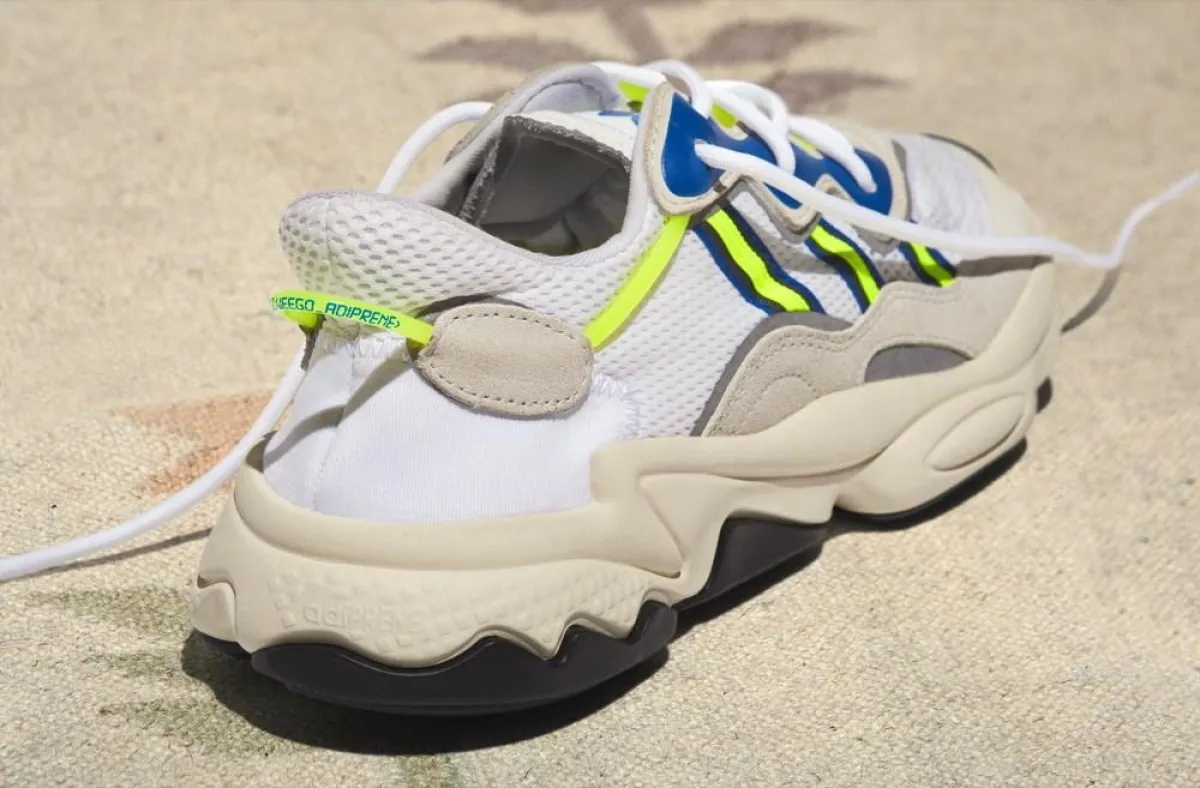 بتصميم يأسر العيون وخطوط رشيقة محددة وأنبوب دعم شفاف، يفرض تصميم OZWEEGO الجديد شكلاً وقيماً حداثية للتصميم الأصلي OZWEEGO 3. وتخليداً للمواد المستخدمة آنذاك، يتميز طراز OZWEEGO الجديد بشبكة كلاسيكية، وجلد غزال وتركيبة TPU في الجزء العلوي مع بطانة من القماش. ويأتي الحذاء باللون الأبيض ولمسات من الأصفر والأزرق، ليخلق تعبيراً جريئاً متجدداً لفترة لا تنسى في عالم تصميم الأحذية.