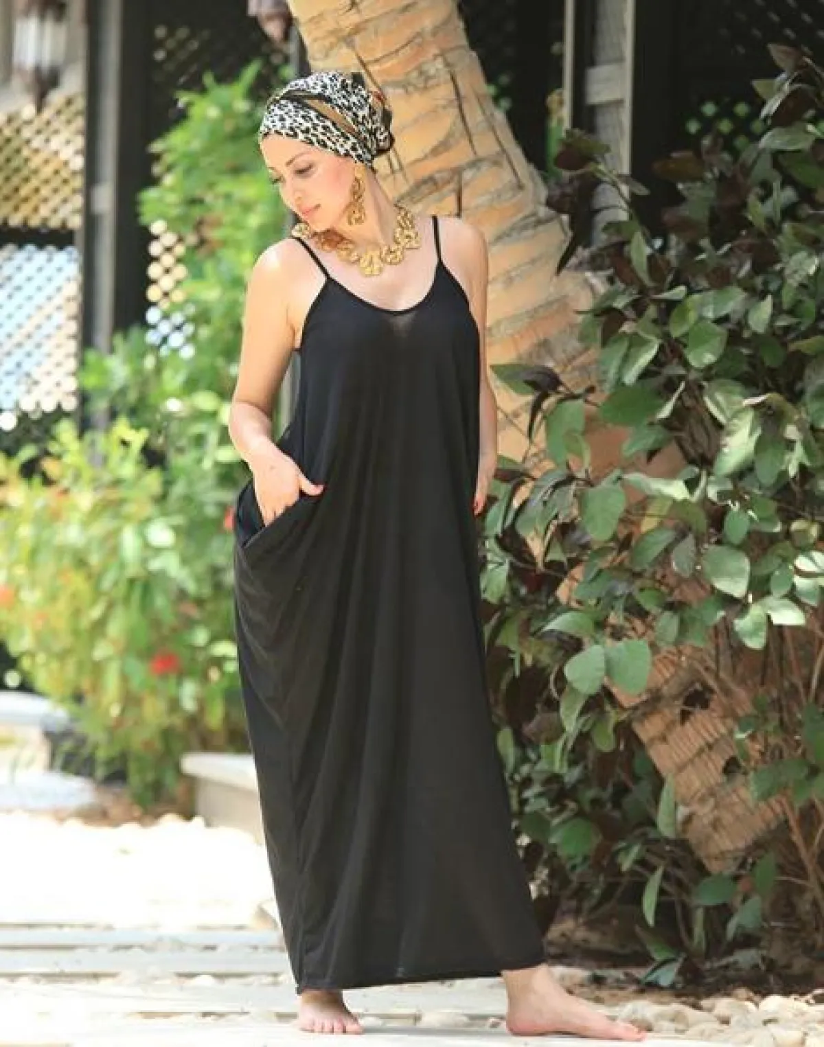 في أحد المشاوير الصيفية شاهدنا نسرين طافش وقد اختارت فستان ماكسي باللون الأسود بقصة منسدلة واسعة ونسقت معه مجوهرات بارزة باللون الذهبي وأكملت اللوك باختيارها سكارف معرق بنقشة النمر استعملته كتربان زينته به رأسها.