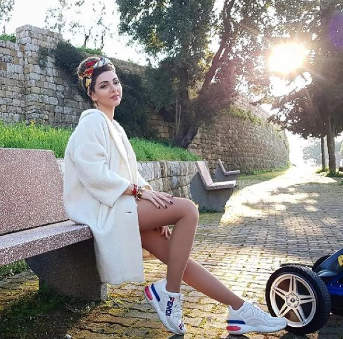نادين نجيم من النجمات اللواتي يعشقن استعمال السكارف وقد لاحظنا ذلك في مسلسل خمسة ونص الذي عرض في رمضان 2019، كما أنها في هذه الاطلالة الأنيقة أيضاً اختارت سكارف معرق من الحرير مع تيور باللون الأحمر ونظارات شمسية بتصميم عصري.