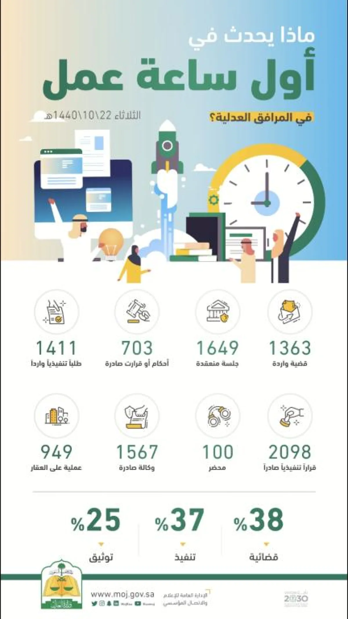كما تلقّت المحاكم خلال أول ساعة 1363 قضية واردة، وتلقّت محاكم التنفيذ 1411 طلباً تنفيذياً جديداً.