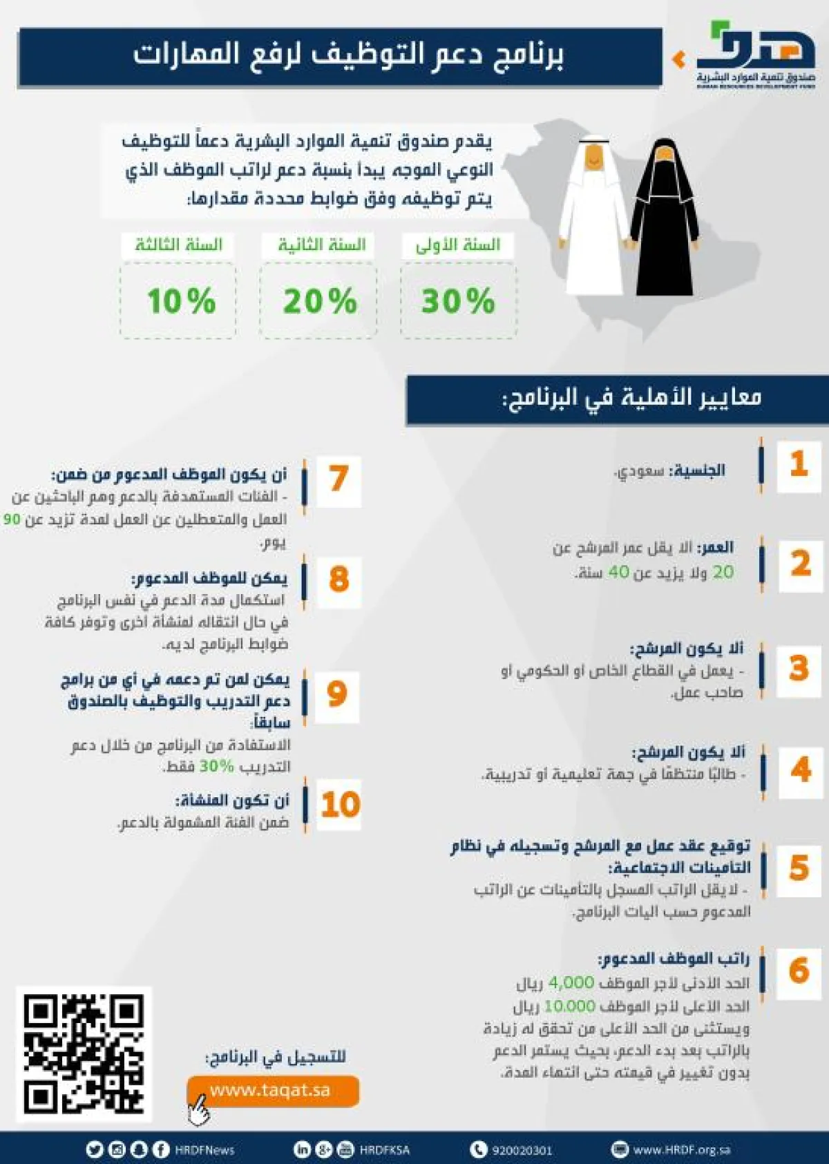 وأقرت آلية عمل برنامج دعم التوظيف لرفع المهارات، بتوجيه 70 % من دعم البرنامج للتوظيف و30 % لدعم التدريب، بهدف الاستثمار في رأس المال البشري، فيما تمتد فترة الدعم المالي لراتب الموظف المدعوم عن طريق البرنامج، إلى 36 شهرًا، بمعدل 30 % من الراتب الشهري للسنة الأولى من الدعم، و20% للسنة الثانية، و10 % للسنة الثالثة، كما تضاف نسبة إضافية للدعم، عند توظيف المنشأة للإناث أو الأشخاص ذوي الإعاقة، وعند التوظيف في المدن الصغيرة والقرى، وفي حال كان حجم المنشأة 50 عامل فأقل.