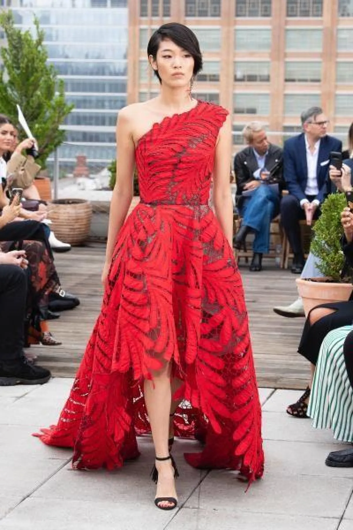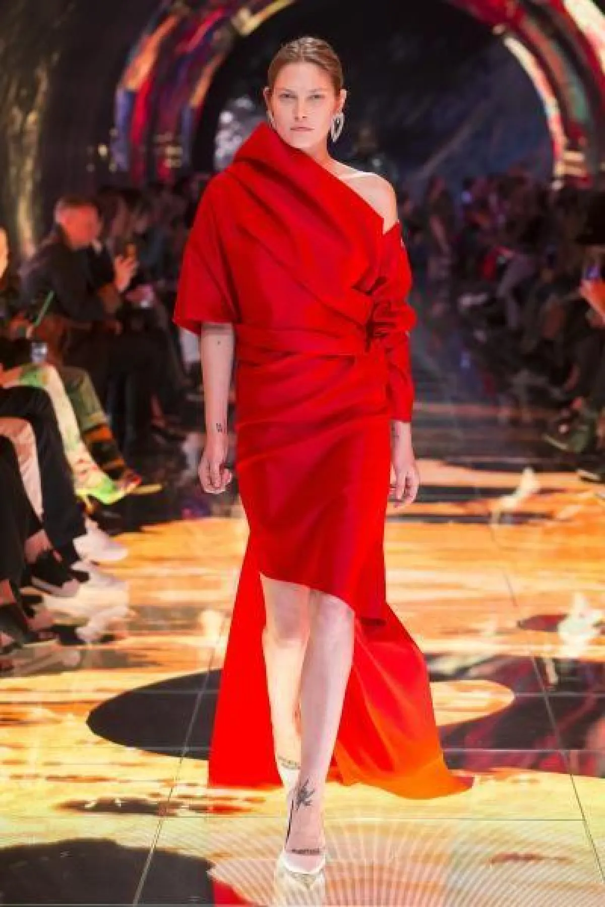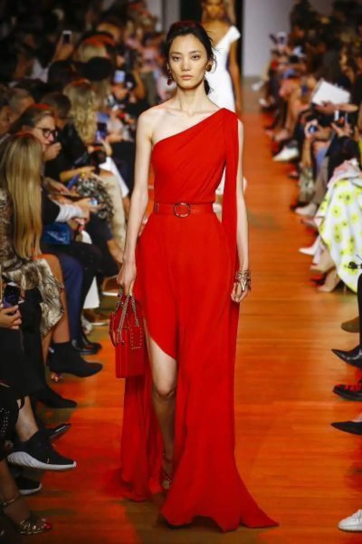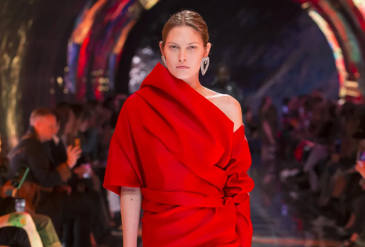 عرضت دار Balenciaga فستاناً مميزاً باللون الأحمر بقَصّة High Low dresses، وبـ«كتف» مكشوفة، وأكمام «منتفخة».