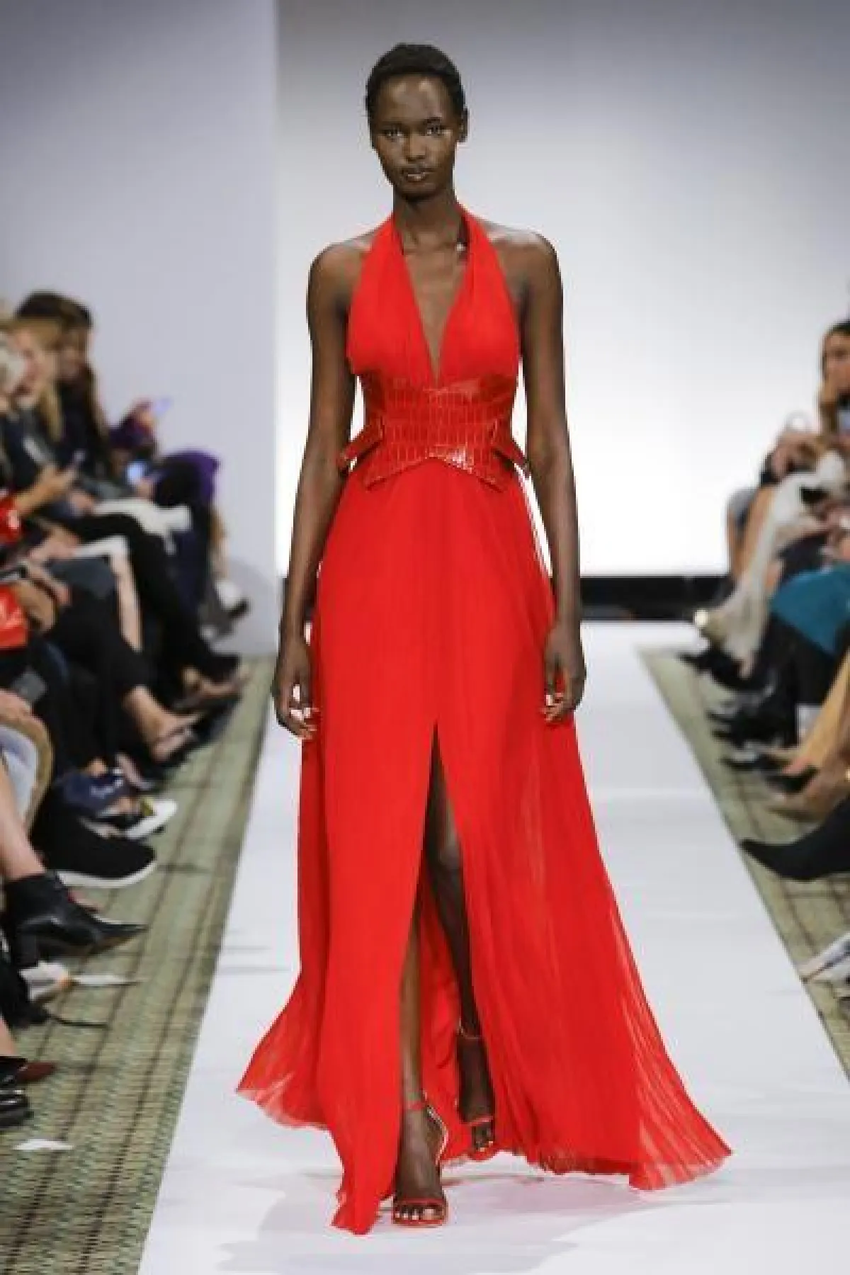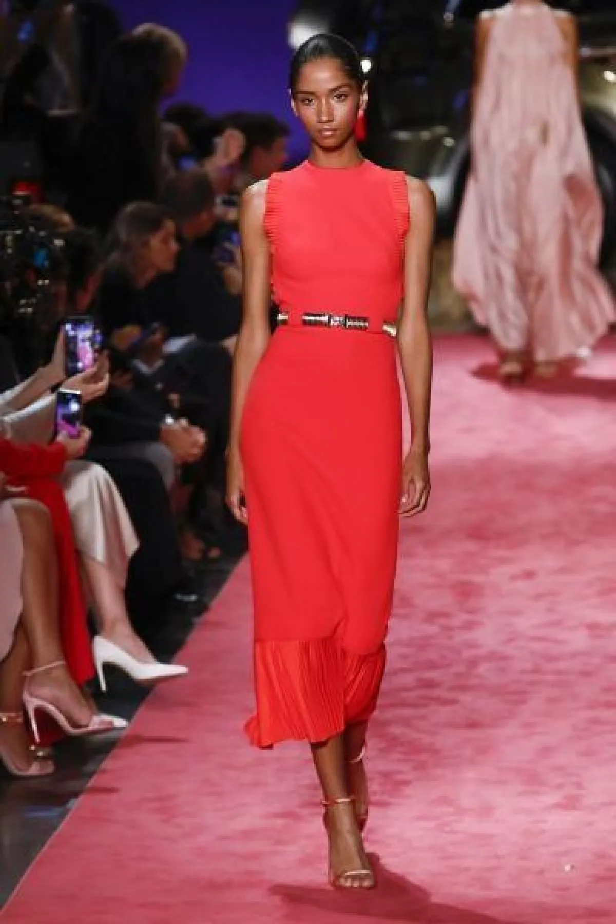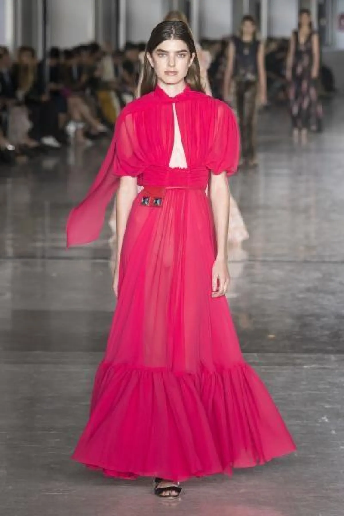 عرضت دار Balenciaga فستاناً مميزاً باللون الأحمر بقَصّة High Low dresses، وبـ«كتف» مكشوفة، وأكمام «منتفخة».