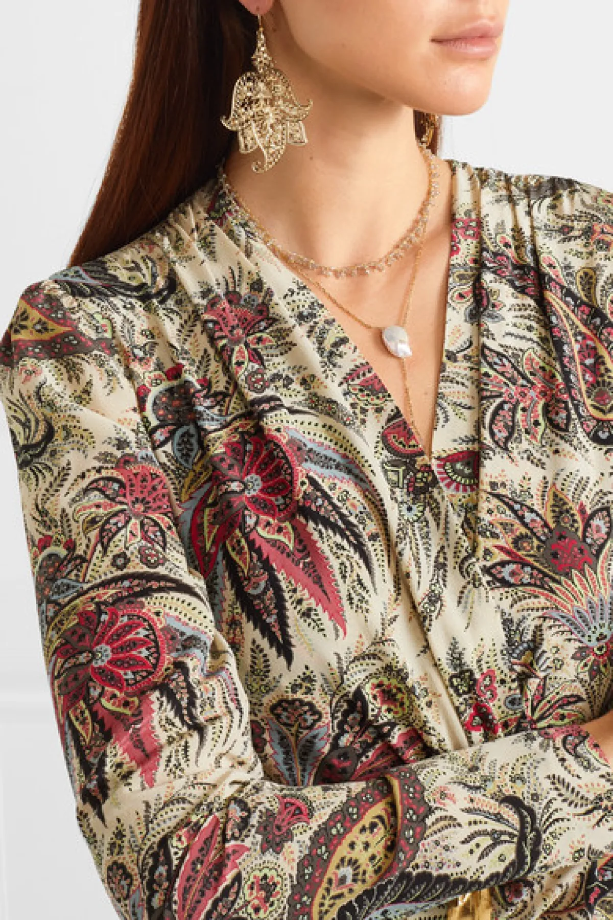 أطلقت دار إيترو أقراط أذن متدليّة من اللون الذهبي بموديل مميّز، والذي يمكن تنسيقه مع اطلالة مسائية بألوان فاتحة ومنعشة .