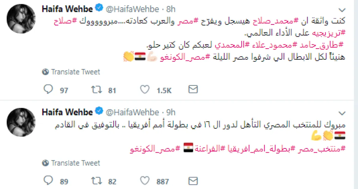هيفاء غردت عبر تويتر فور انتهاء مباراة المنتخب المصري ونظيره الكونغولي بهدفين دون رد، قائلة: كنت واثقة ان #محمد_صلاح هيسجل ويفرّح #مصر والعرب كعادته....مبروووووك #صلاح #تريزيجيه على الأداء العالمي .. #طارق_حامد #محمود_علاء #المحمدي لعبكم كان كتير حلو.. هنيئًا لكل الأبطال اللي شرفوا مصر الليلة #مصر_الكونغو.