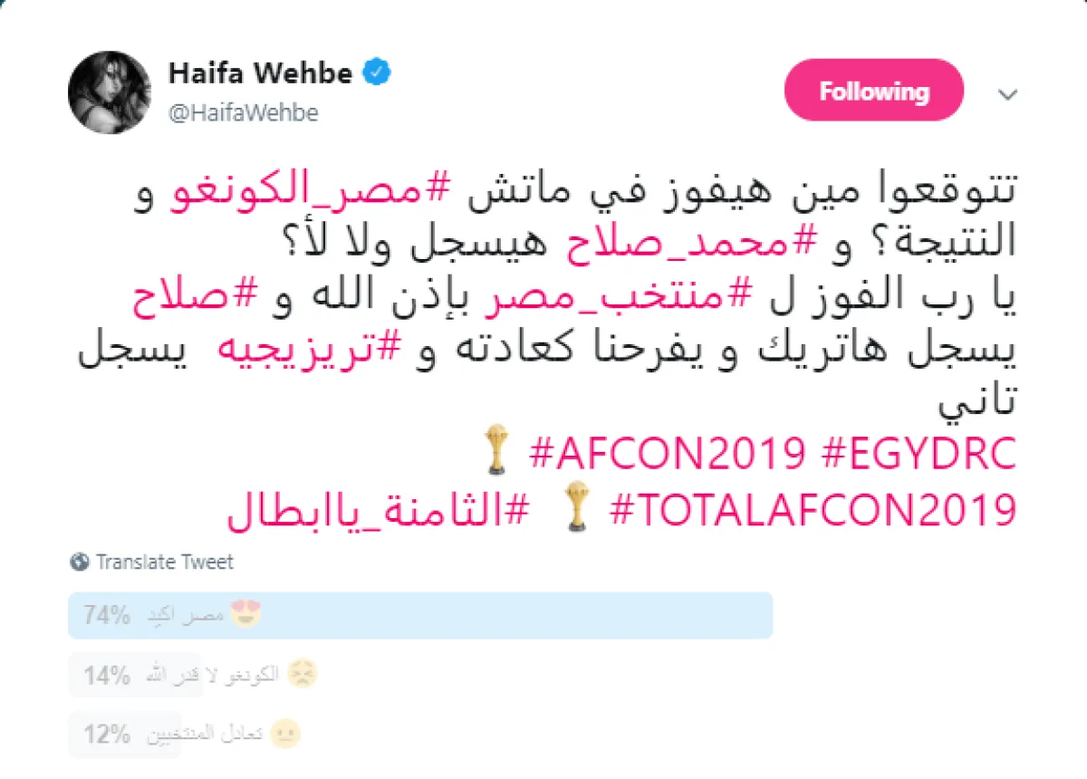 وتابعت قائلة: يا رب الفوز ل #منتخب_مصر بإذن الله و #صلاح يسجل هاتريك و يفرحنا كعادته و #تريزيجيه يسجل تاني، وقامت بعمل استطلاع رأي أظهر توقاعت فوز مصر بنسبة 74 بالمئة.