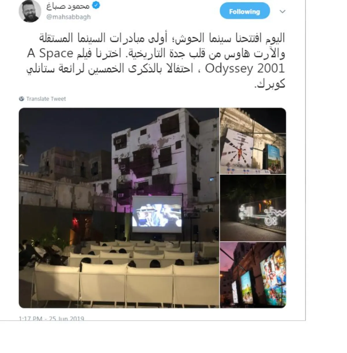 وأعلن صباغ ذلك عبر حسابه في تويتر، حيث قال: "اليوم افتتحنا سينما الحوش، أولى مبادرات السينما المستقلة والآرت هاوس في قلب جدة التاريخية. اخترنا فيلم A Space Odyssey 2001 احتفالاً بالذكرى الخمسين لرائعة ستانلي كوبرك".