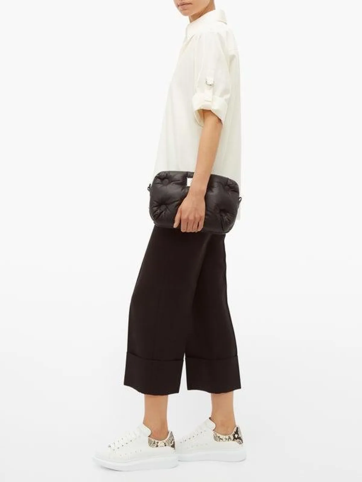 اجمعي بين الاطلالة الرسمية والكاجوال كما فعلت مدونة الموضة العالمية أوليفيا باليرمو، فيمكنكِ تنسيق بنطلون فضفاض رسمي من اللون الأسود، مع قميص نسائي من اللون الأبيض، وحذاء رياضي من اللون الأبيض من ألكساندر مكوين .