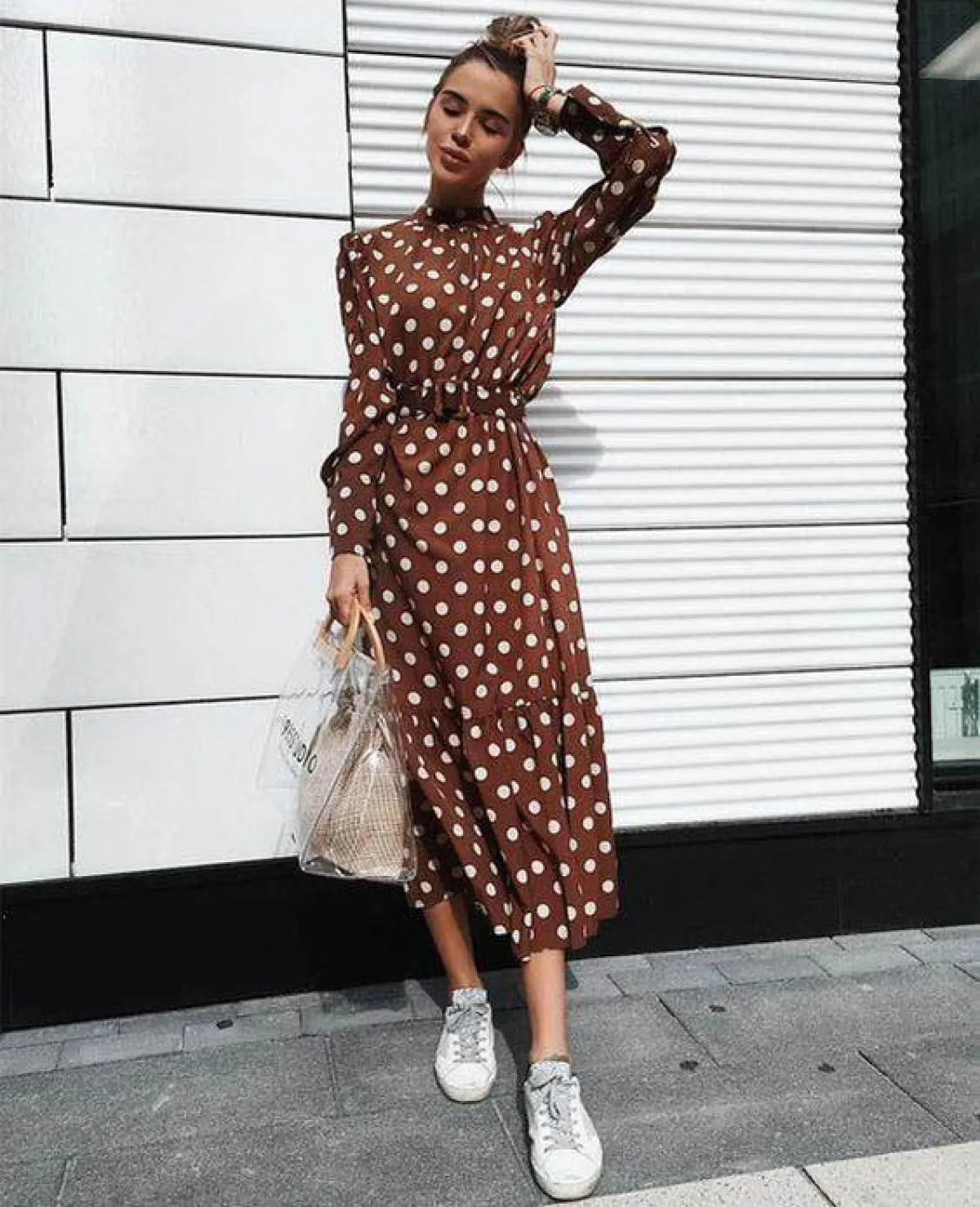 من قال إنه لا يمكنكِ دمج صيحتين في آنٍ واحد ؟ نسّقي فستان ميدي من صيحة البولكا دوت مع حذاء رياضي وحقيبة كبيرة الحجم .
