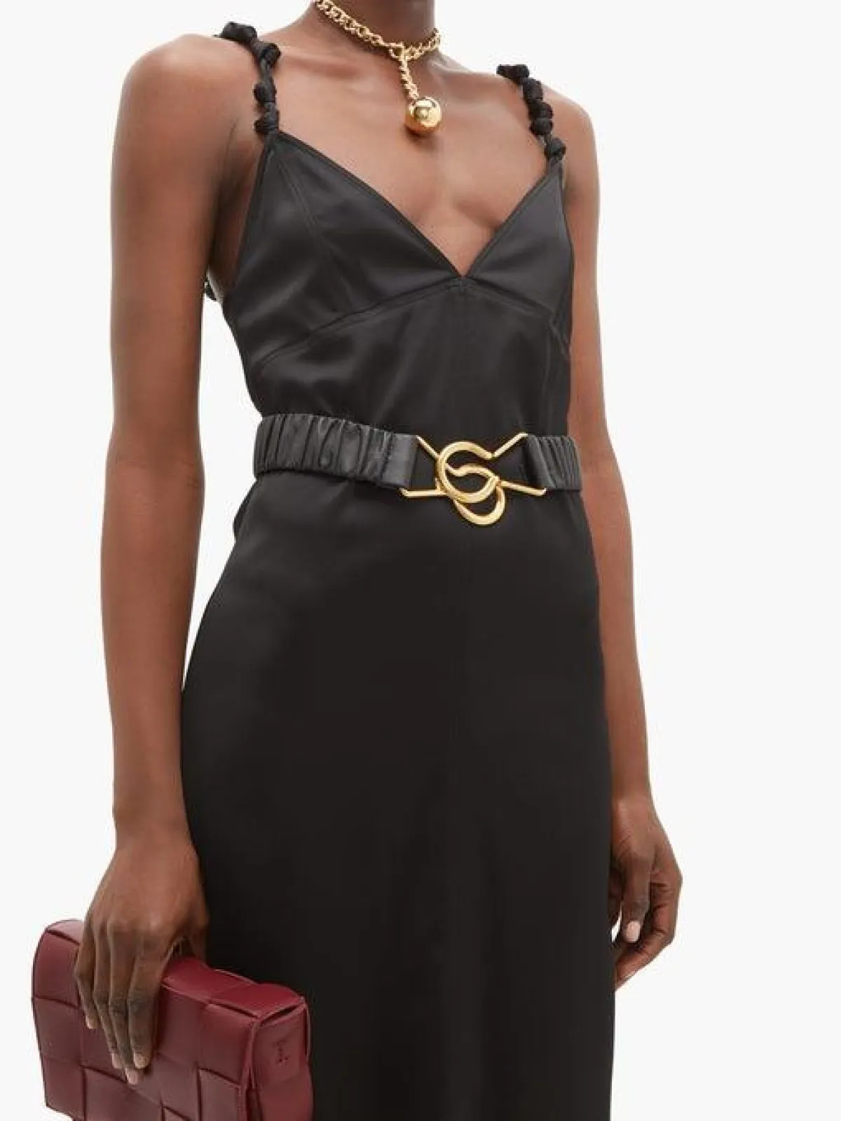 نسّقي حزام الخصر من بوتيغا فينيتا من اللون الذهبي والجلد، مع فستان حرير من اللون الأسود وحقيبة الكلاتش .