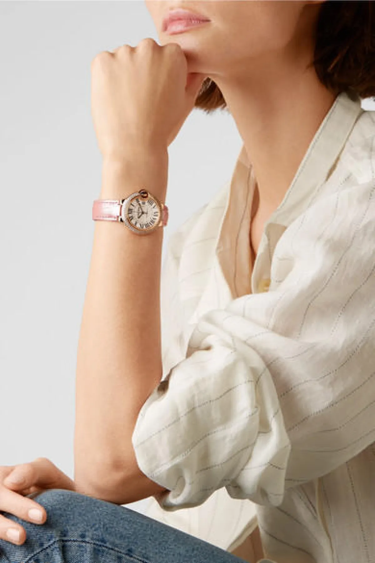 اتّجه دار كارتييه إلى اختيار ساعة بطابع صيفي، مزيّنة بأحجار الماس وجلد من اللون الزهري .