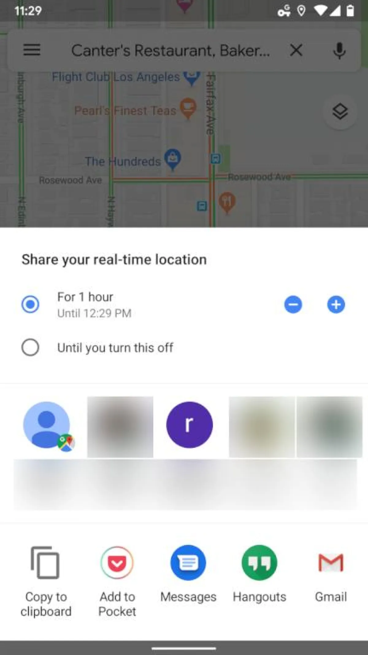• على أندرويد، حدِّد الشخص الذي تريد مشاركة موقعك معه من قائمة جهات الاتصال المقترحة، أو حدِّد تطبيقًا، مثل: Gmail أو الرسائل لإرسال رابط خاص، يمكنك أيضًا اختيار نسخ الرابط إلى حافظة النظام الخاص بك، ثمَّ لصقه في أي مكان تريد.