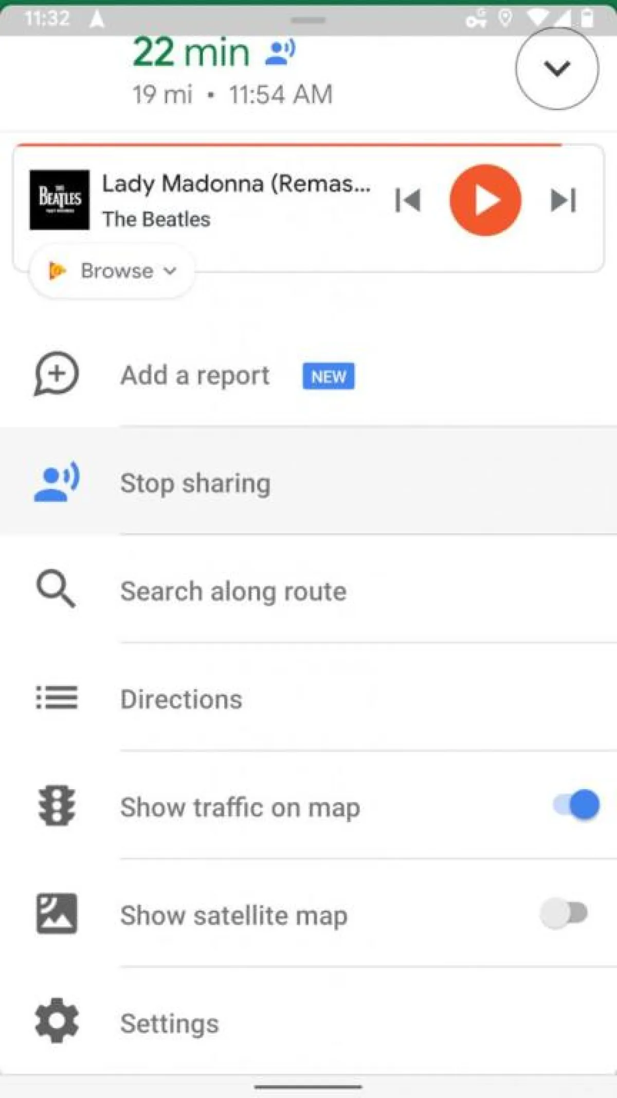 • افتح تطبيق الخرائط، وابدأ في التنقل إلى وجهتك. اسحب للأعلى على الشريط أسفل الشاشة (حيث يتمّ عرض وقت سفرك المتبقي)، ثمَّ حدِّد Share trip progress من القائمة التي تظهر لك.