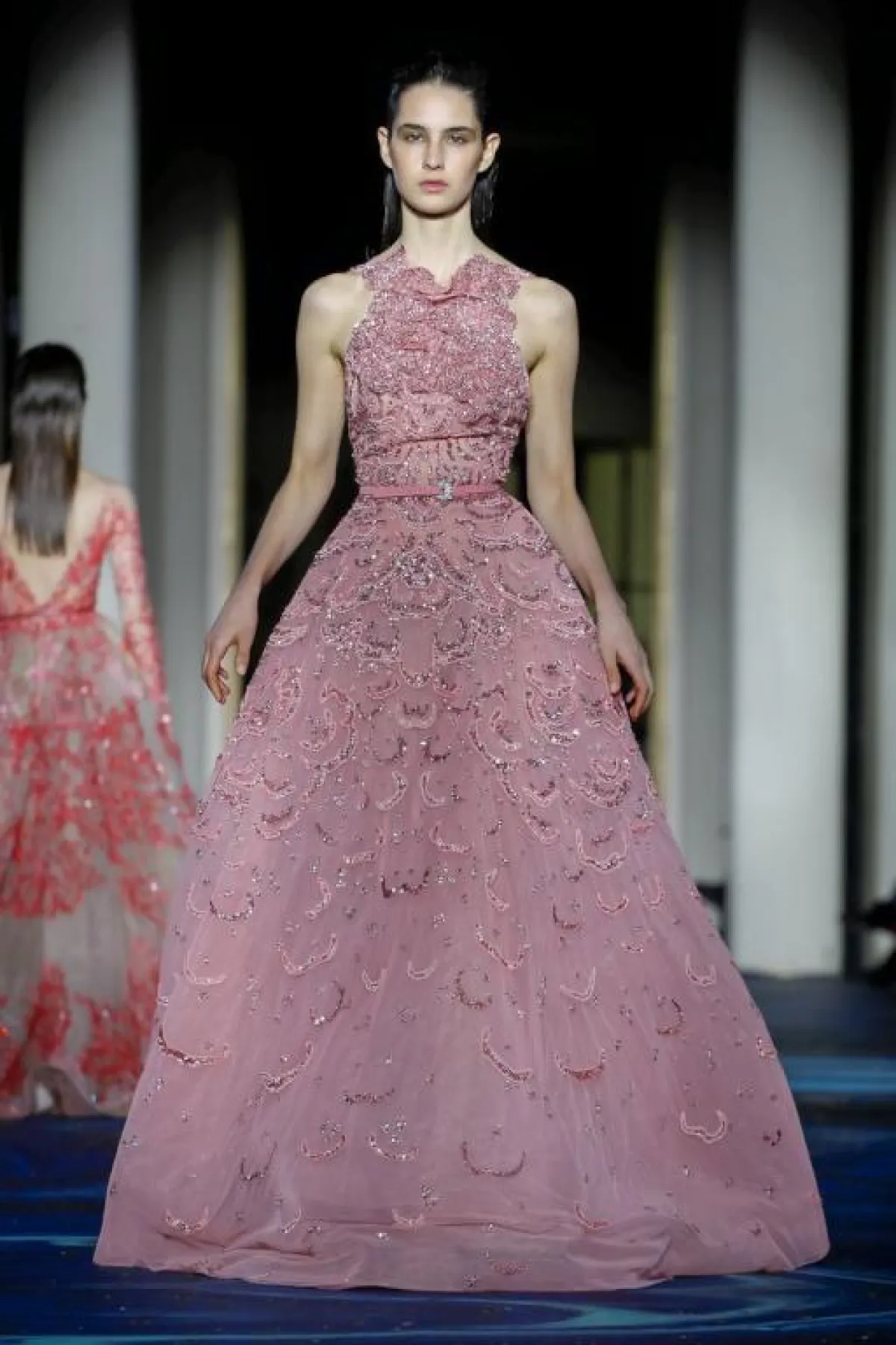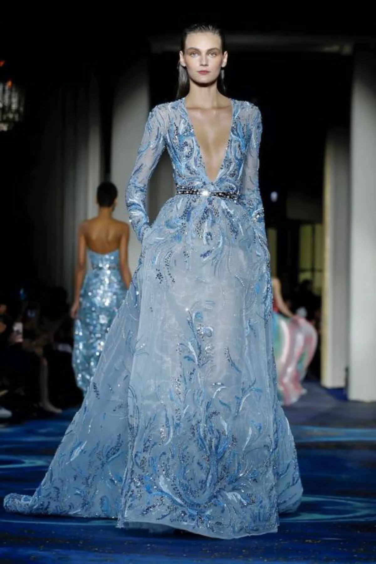 كذلك قدم المصمم فساتين خطوبة منفوشة ومغطاة بتطريزات برّاقة، باللونين الأزرق والوردي، سواء فستان كم طويل بالقبّة الـV، أو فستان Halter بدون أكمام.