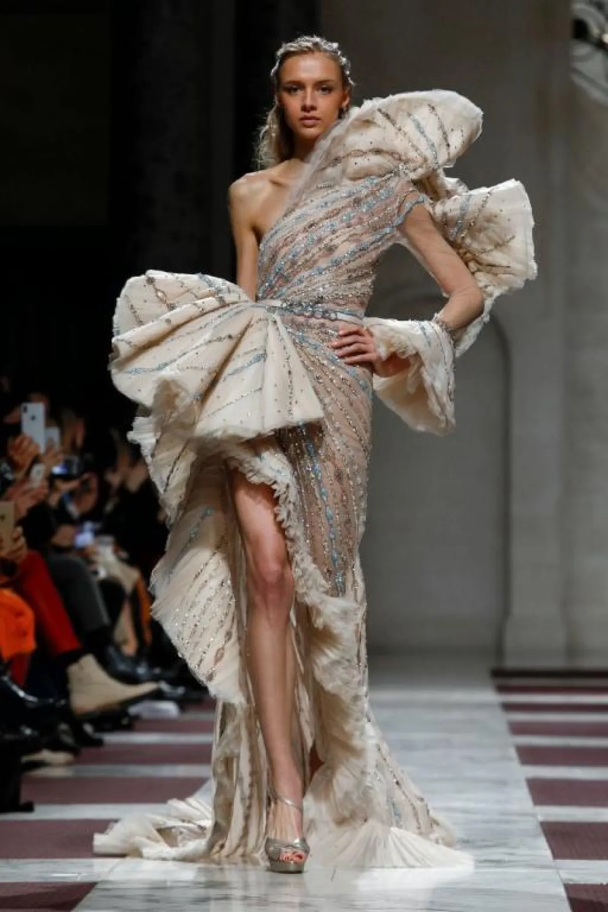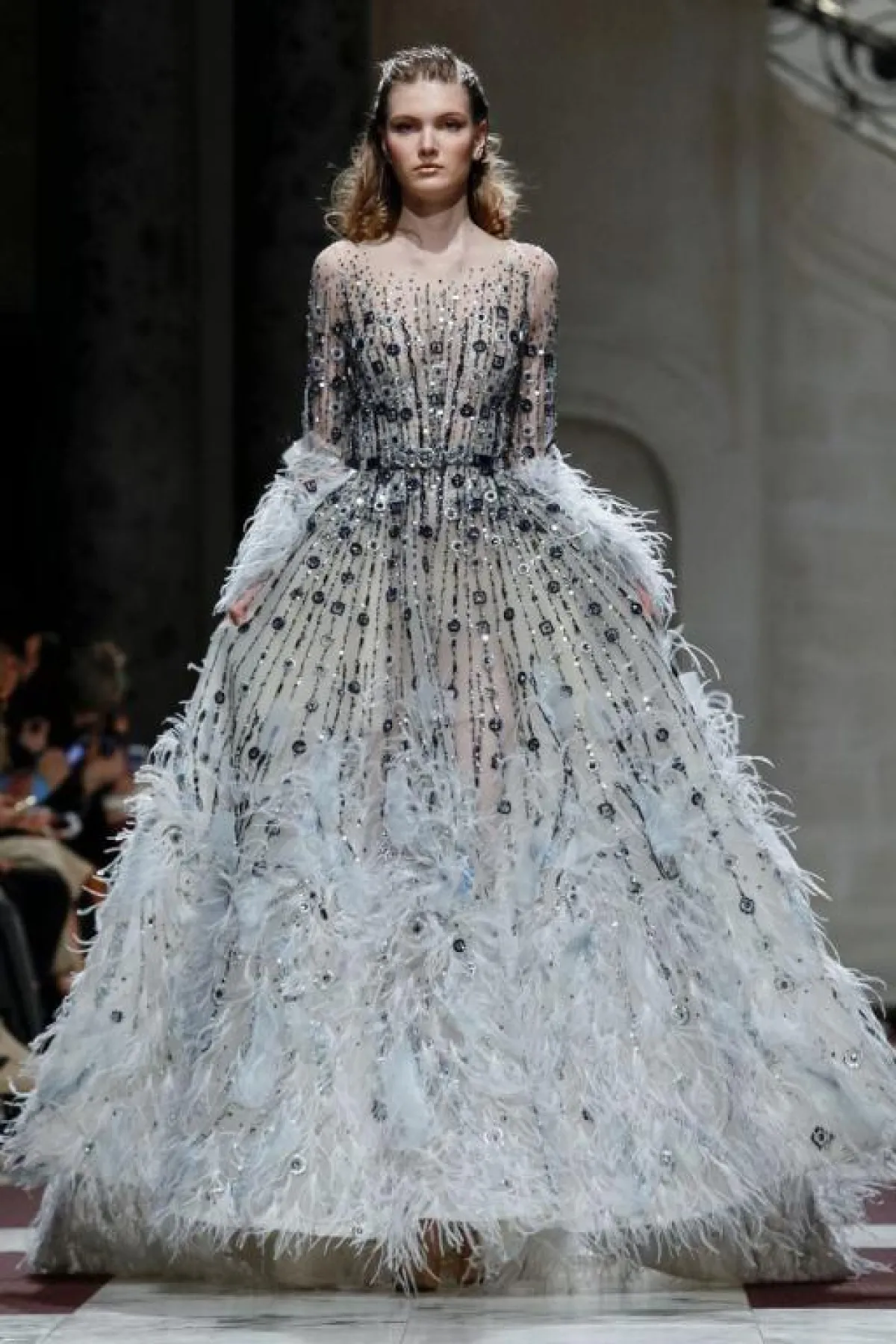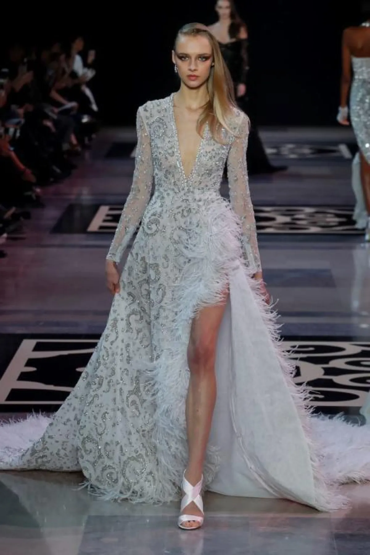 أيضاً قدم المصمم طوني ورد Tony Ward فستان فضي مطرز بقصّة عمودية تكسب العروس طولاً ونحافة مع وشاح تول طويل من الخلف.
