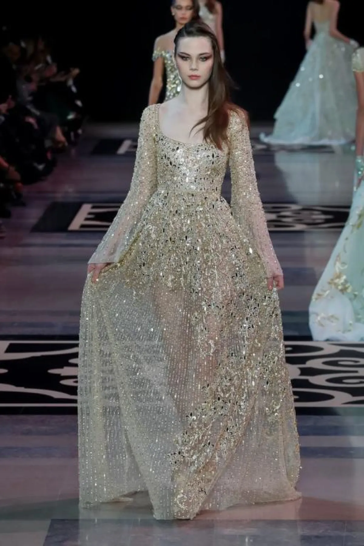 كذلك برز الفساتين بالأكمام الطويلة الشفاف والمطرزة، والتي تنسدل لتلامس الأرض.