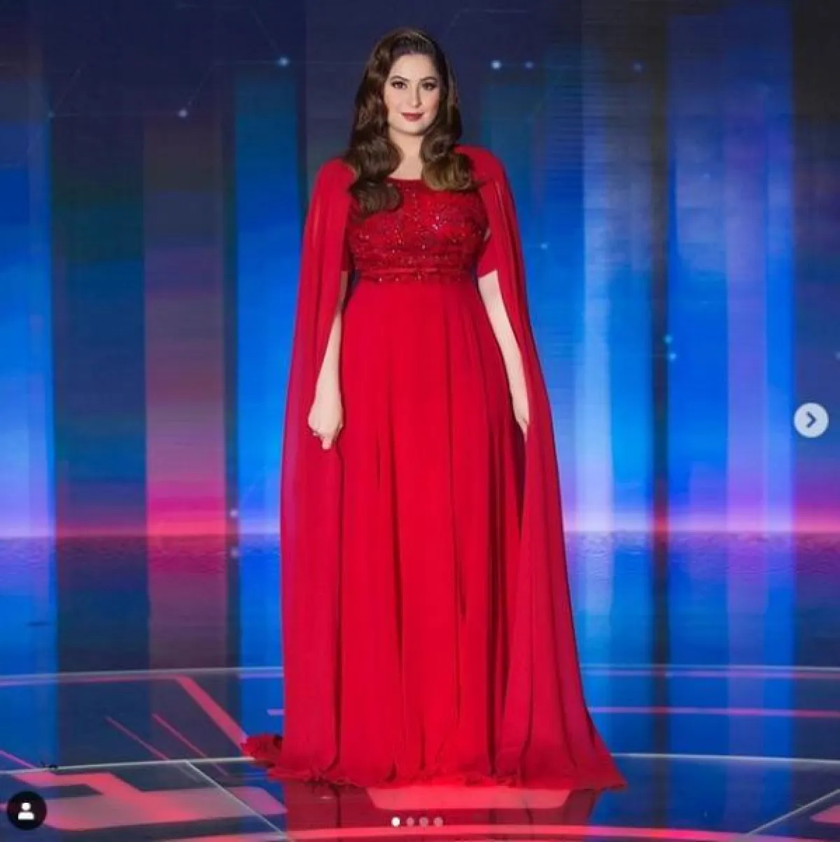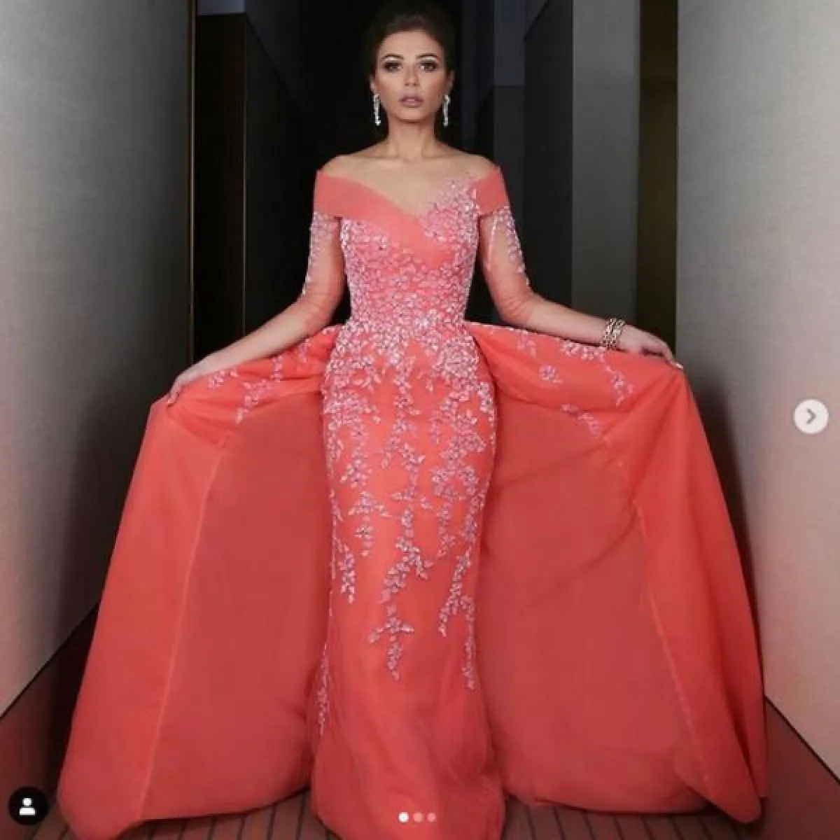 تتسم فساتين مهيرة عبد العزيز بالأنوثة والرقي، فظهرت بفستان ضيق بأكمام طويلة وكاشف للأكتاف Off Shoulder مع تنورة إضافية مفتوحة من الأمام.