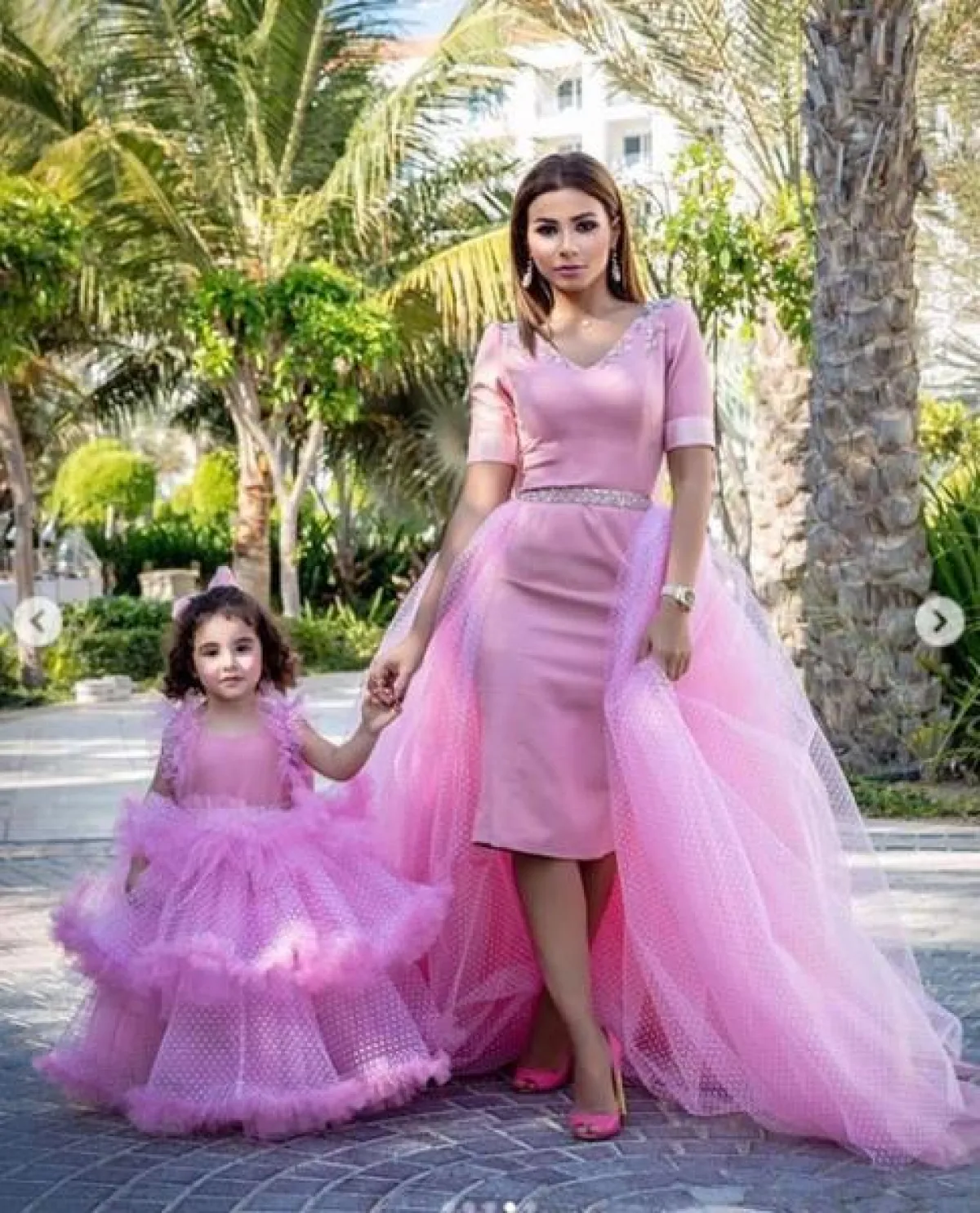 وفي جلسة تصوير مميزة، إرتدت مهيرة فستان أرجواني فاتح مع إبنتها، والفستان بطول متوسط مع تنورة منفوشة طويلة ومزينة بفيونكة من الخلف.