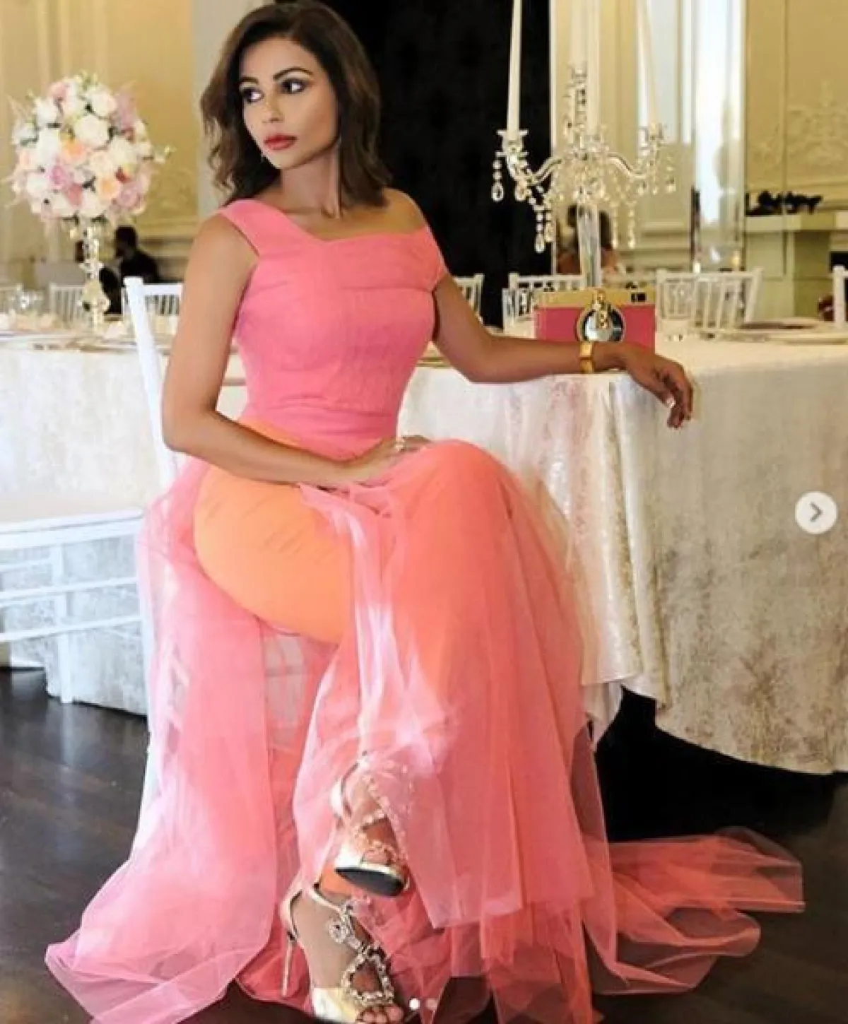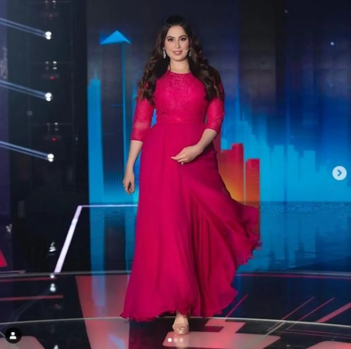 كما إعتمدت مهيرة فستان آخر يجمع بين اللون الوردي والبرتقالي، الطبقة الداخلية بتصميم ضيق، مع طبقة خارجية من التول الوردي.