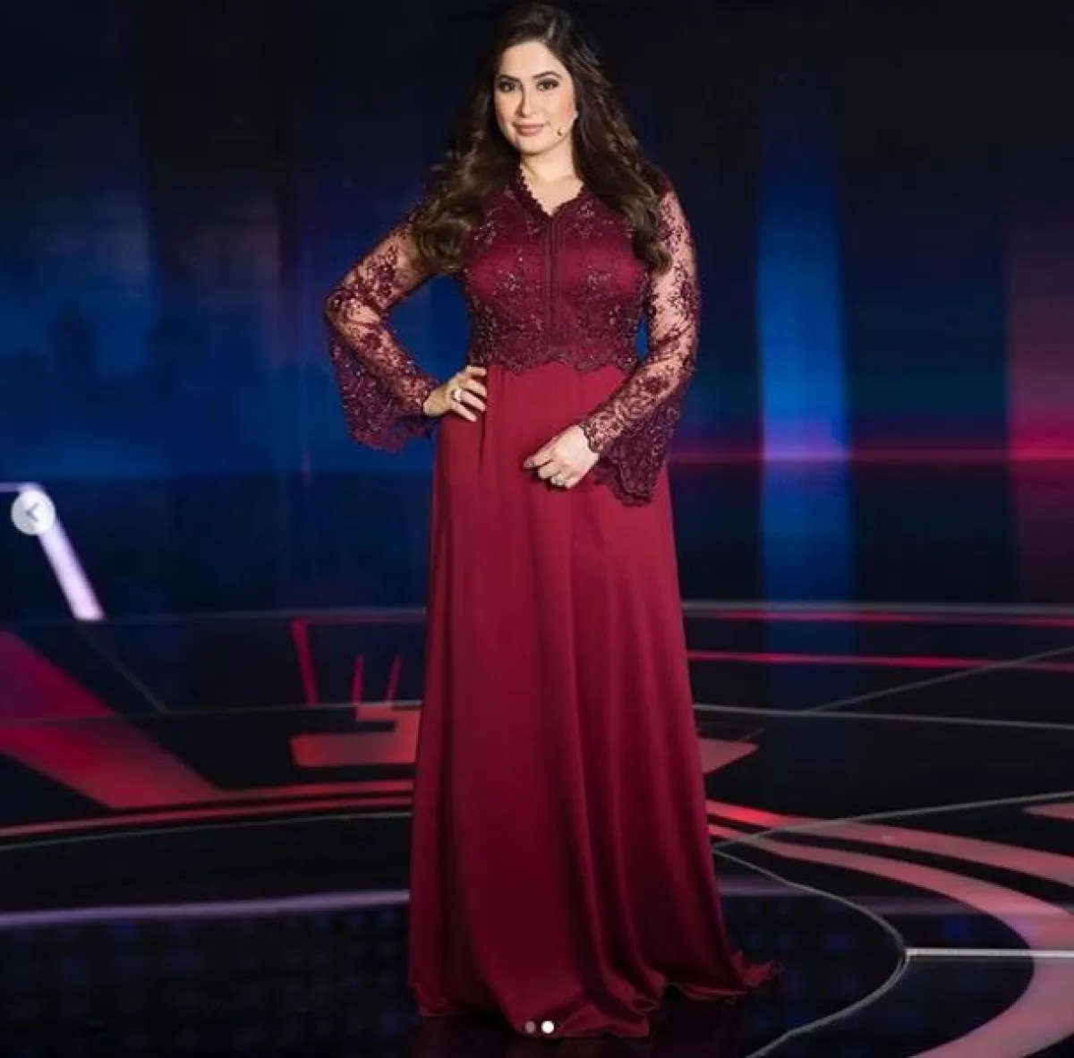 وإرتدت رؤى فستان برغندي مزين بتطريزات برّاقة على الصدر، مع أكمام طويلة شفافة.