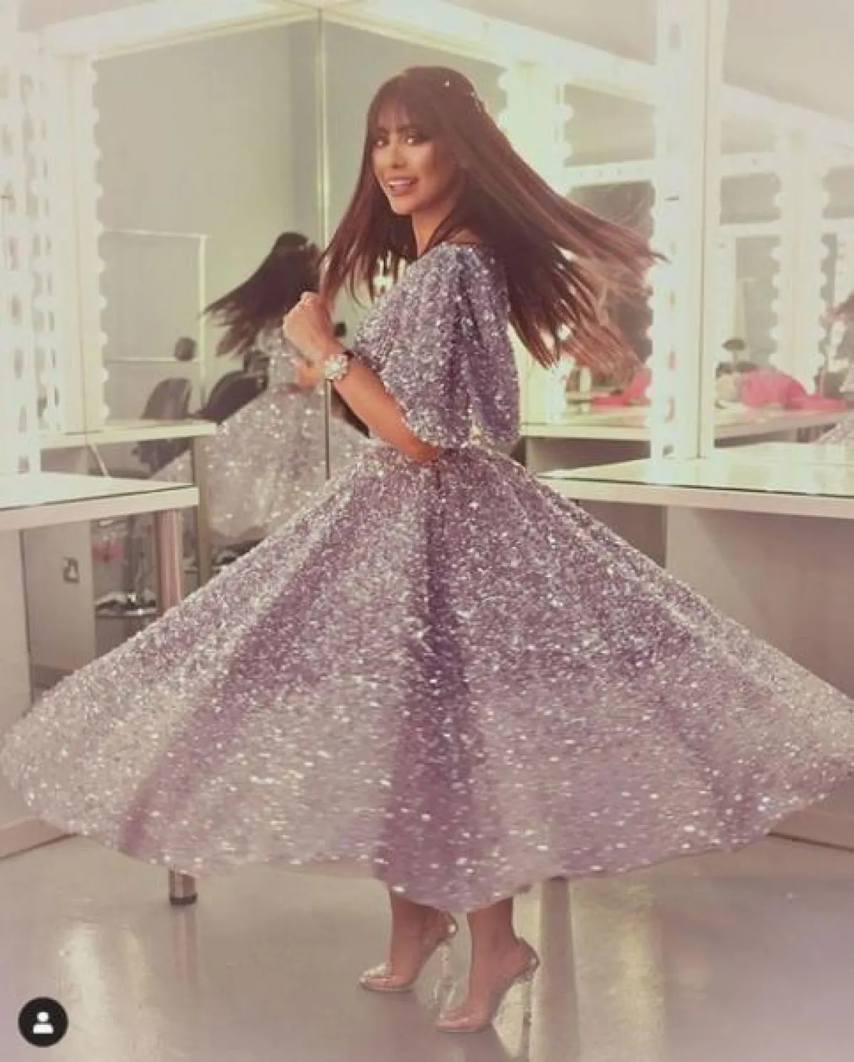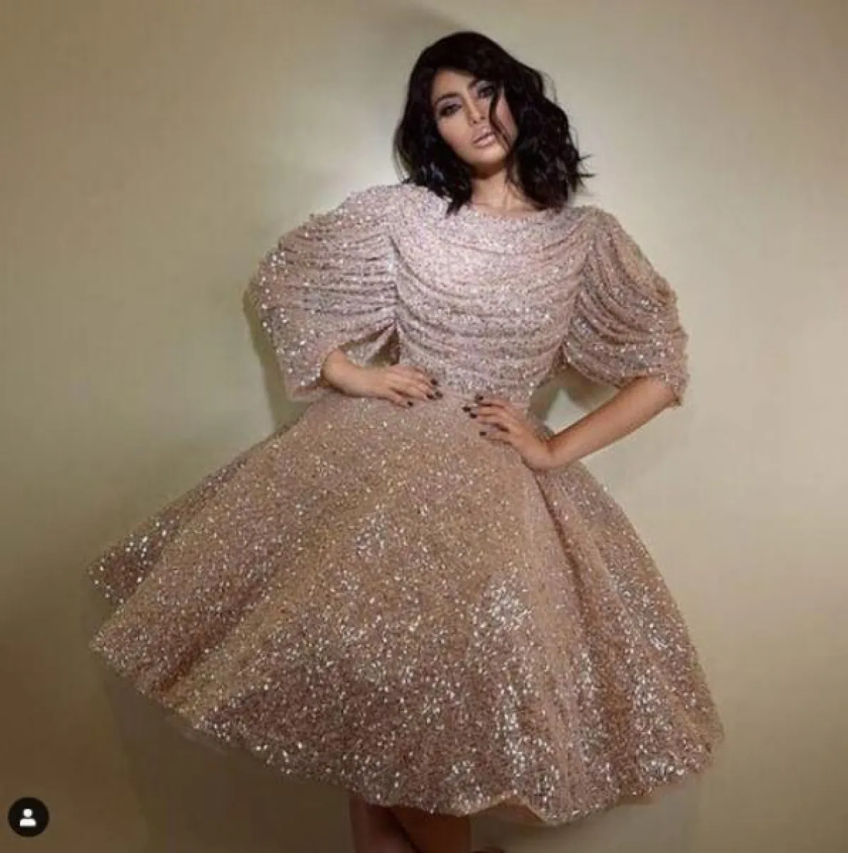 كما إرتدت شيلاء فستان منفوش ومغطى بالتطريزات البرّاقة بطول متوسط مع أكمام قصيرة واسعة.