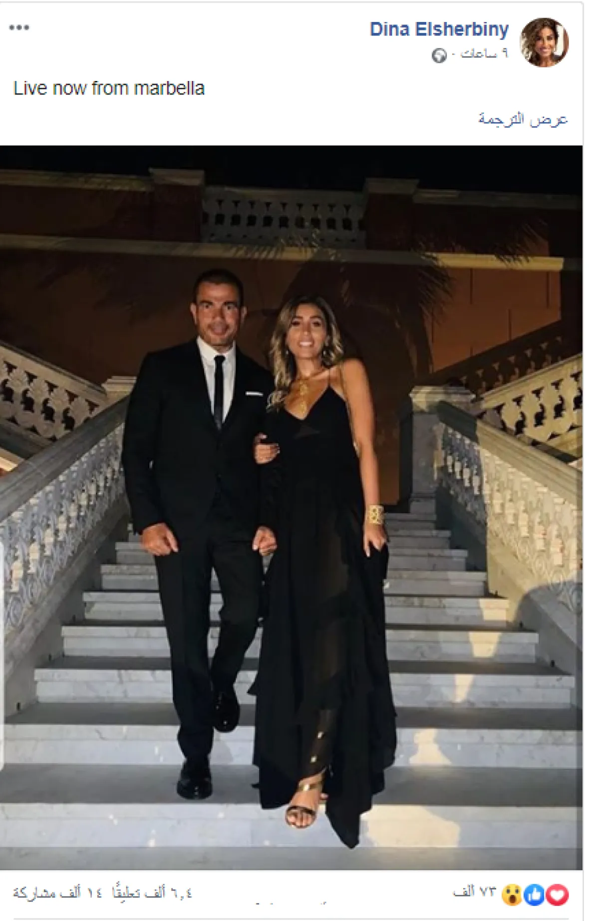 بعد ثلاث سنوات من الأخبار والشائعات المتداولة حول طبيعة العلاقة بين المطرب عمرو دياب والفنانة دينا الشربيني، قام دياب للمرة الأولى بنشر صورة تجمعه بدينا عبر حسابه الموثق بموقع إنستقرام، وقامت الشربيني بنشر نفس الصورة بذات التوقيت لكن عبر حسابها بموقع الفيس بوك، وعلق الثنائي بإشارة إلى تواجدهما في ماربيلا بإسبانيا، وعلم "سيدتي نت" أن دياب اصطحب دينا لحفل زواج أقيم هناك، وسيتوجهان لاحقا إلى اليونان ليقدم حفلا غنائيا في ميوكونوس وهي نفس الجزيرة التي تردد أنها استضافت حفل زفافهما العام الماضي.